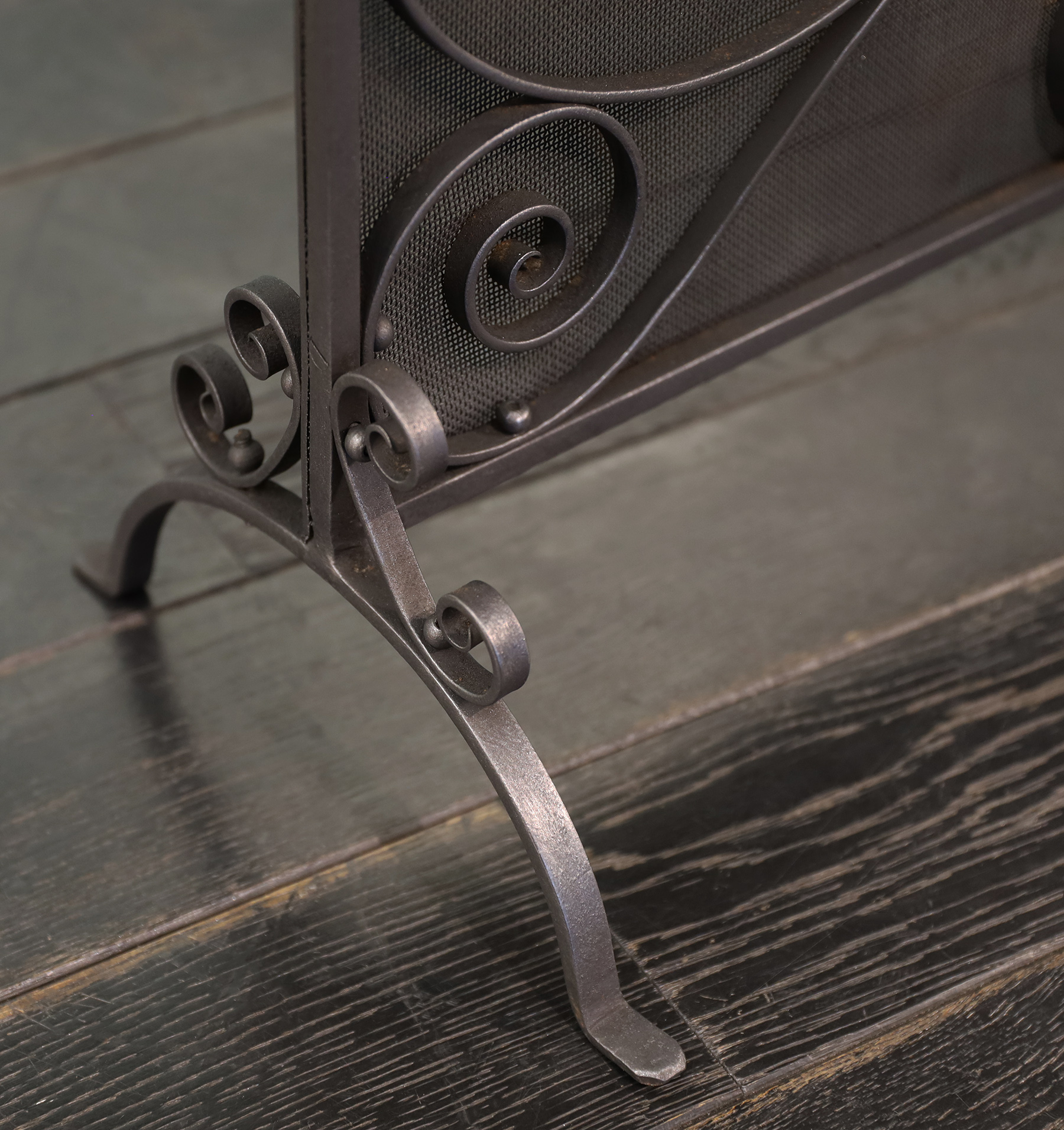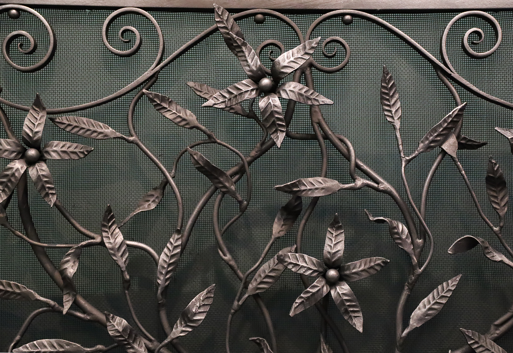 Ornate Wrought Fire Screen with Scrollwork & Wild Flowers