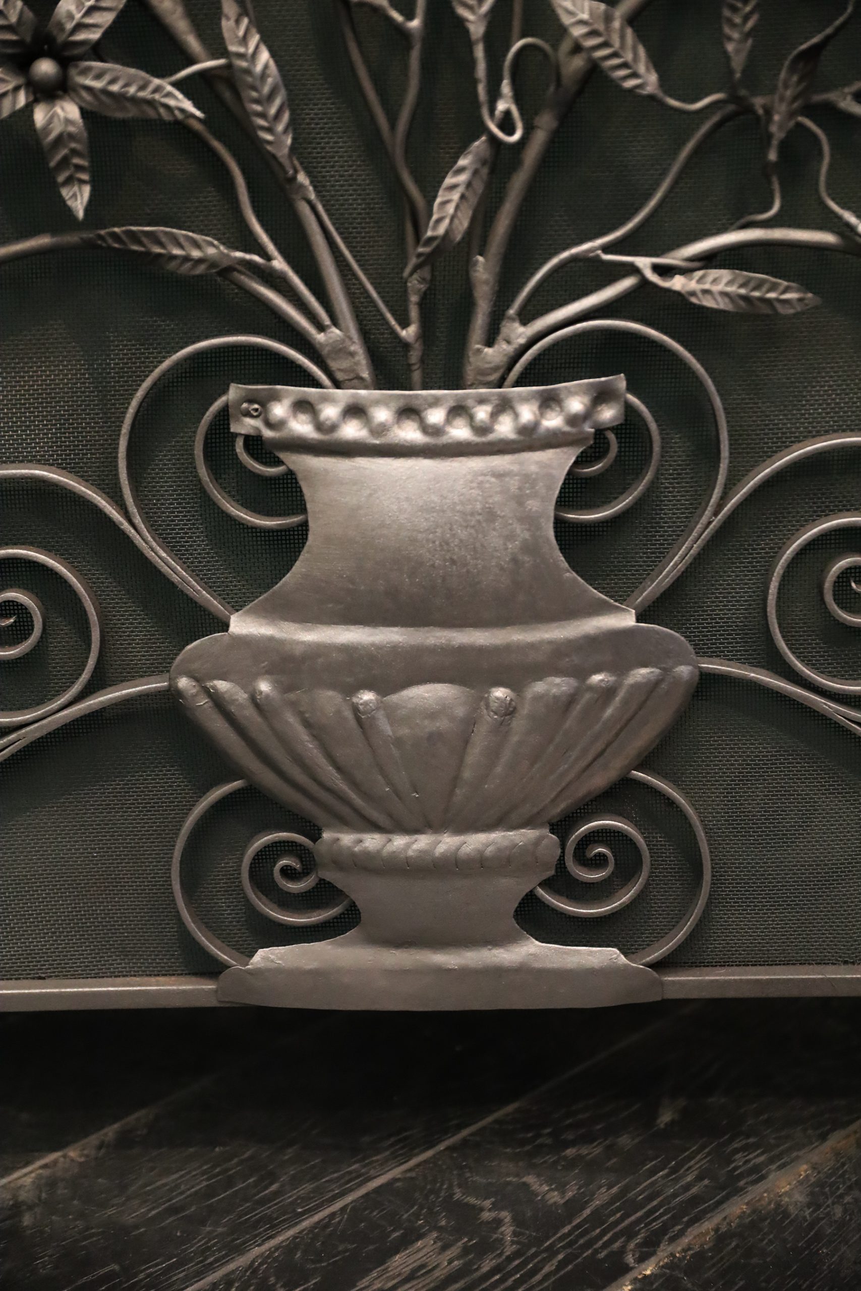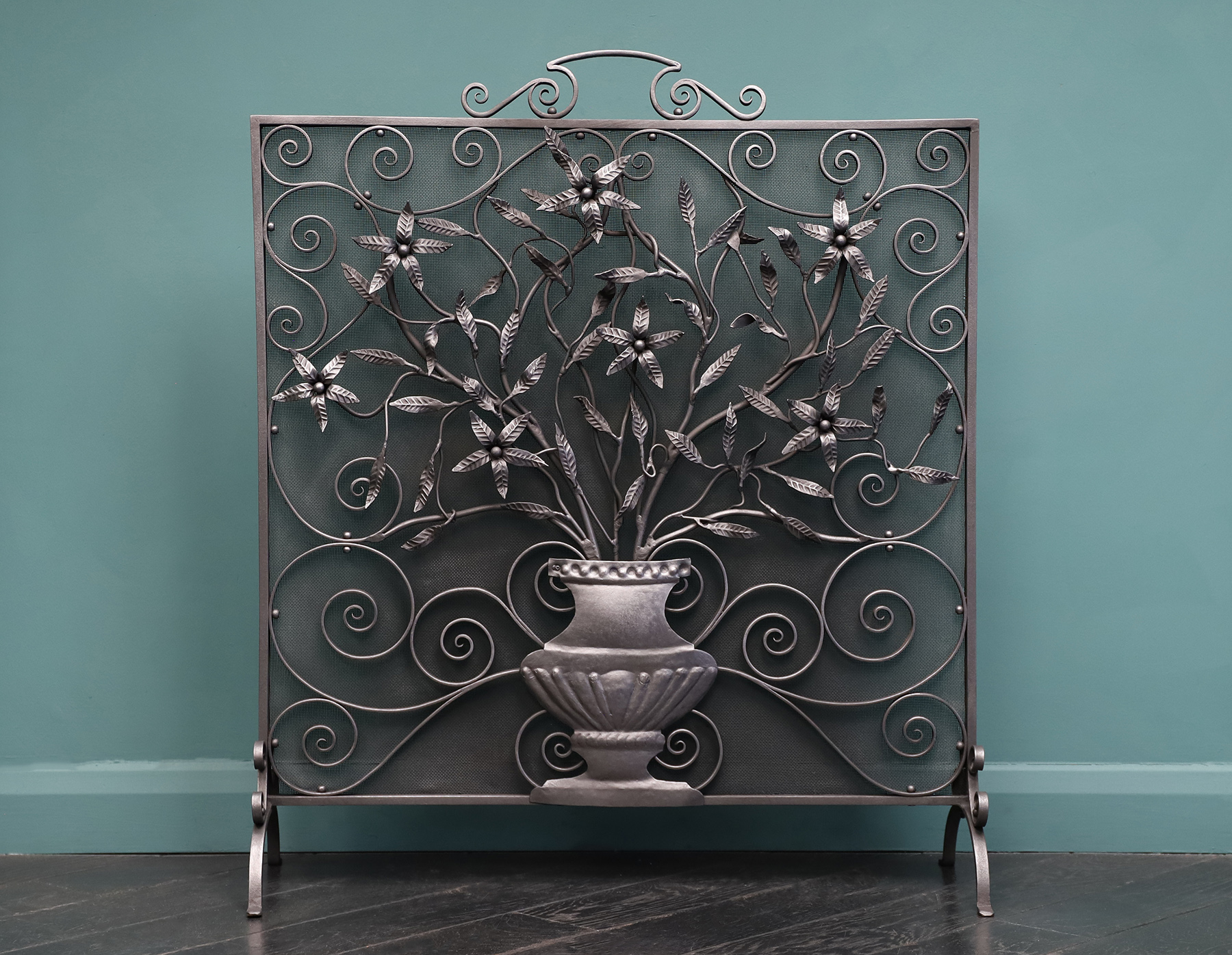 An ornate wrought fire screen with scrollwork and wild flowers. The ribbed central vase houses the carefully arranged foliage and the exquisitely formed wild-climbing flowers, framed by scrolls all on arched supports. Shaped wrought handle uppermost.