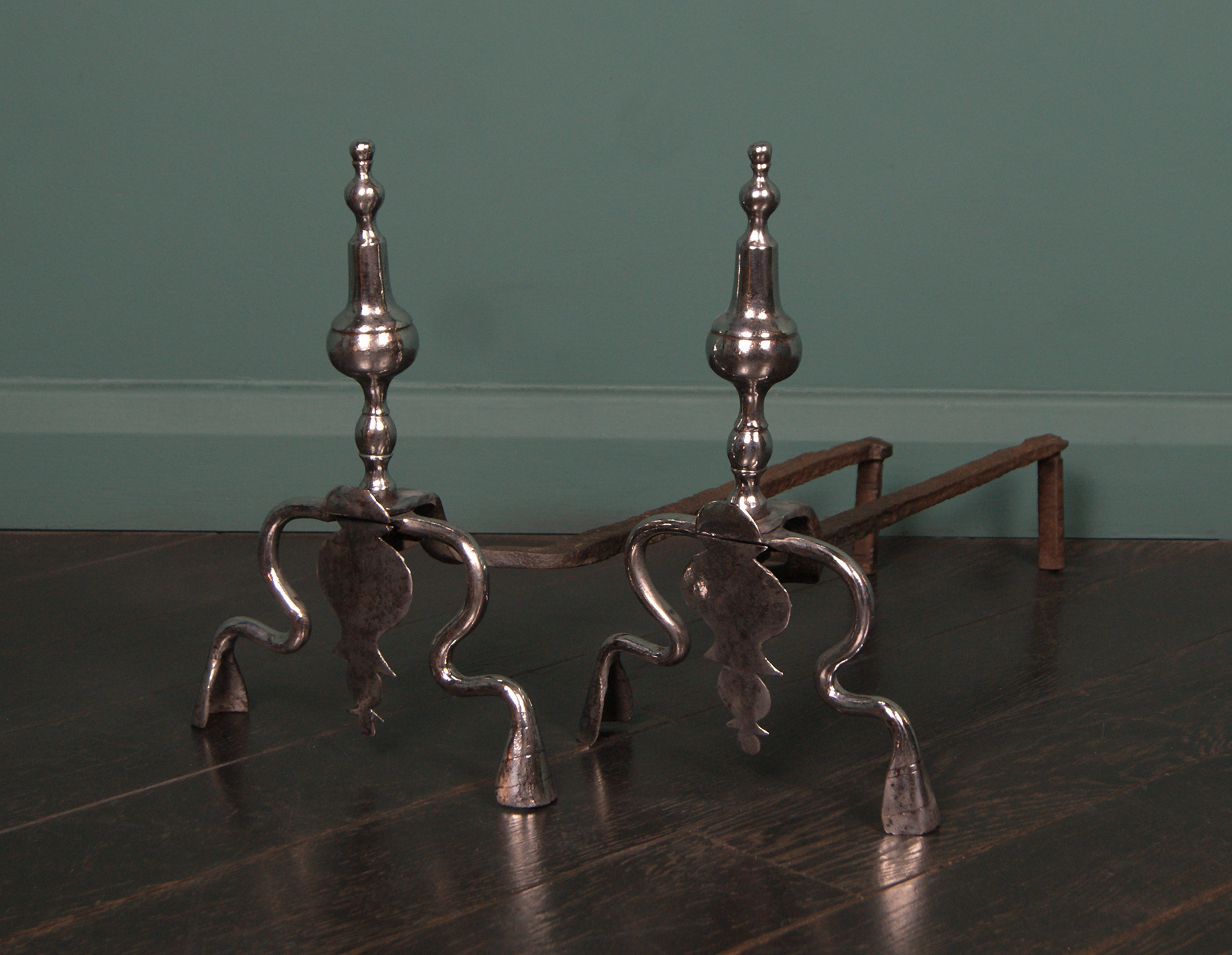 A beautiful pair of 18th century French wrought-iron fire dogs with hoof-feet and tail detail. Restored.