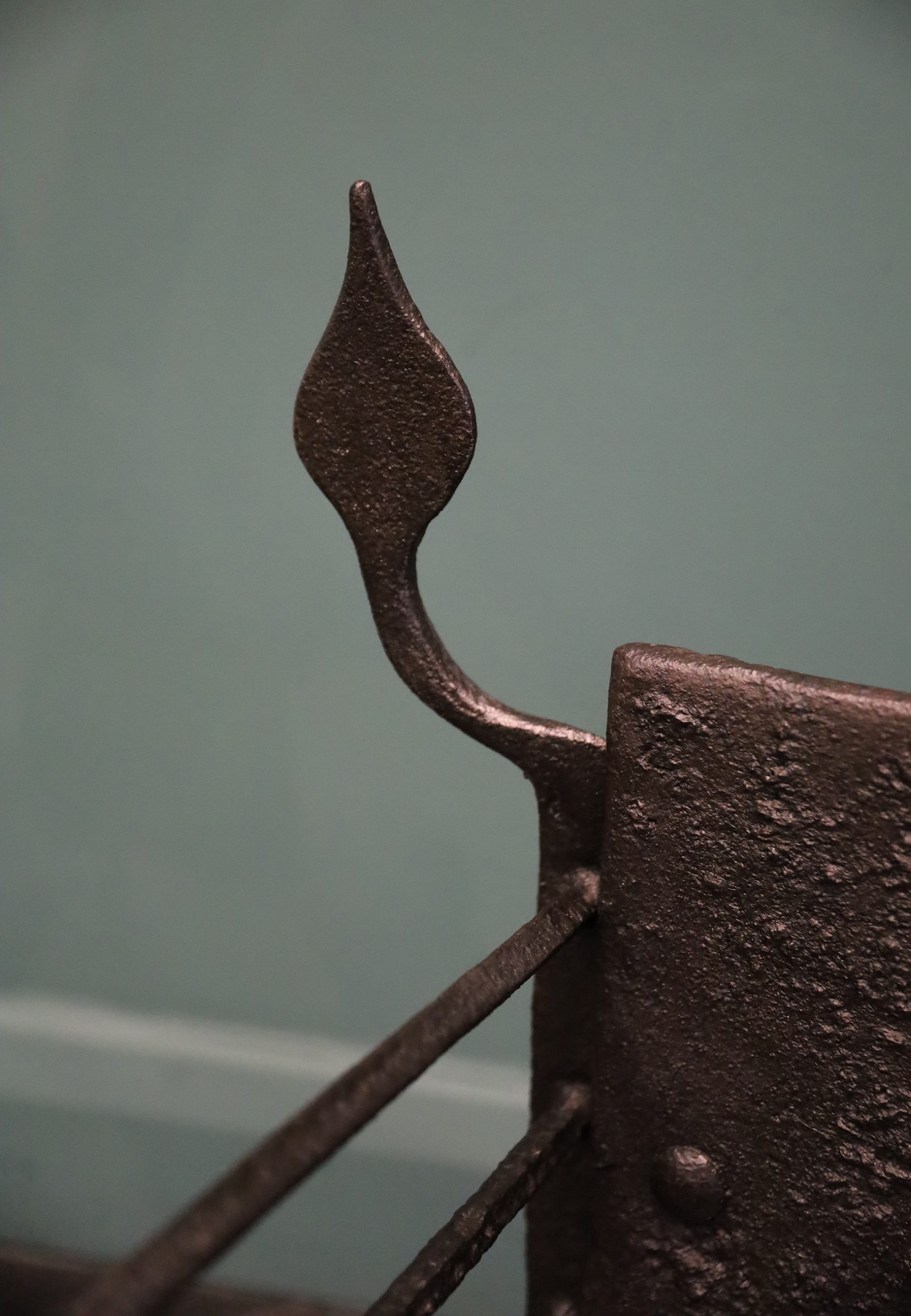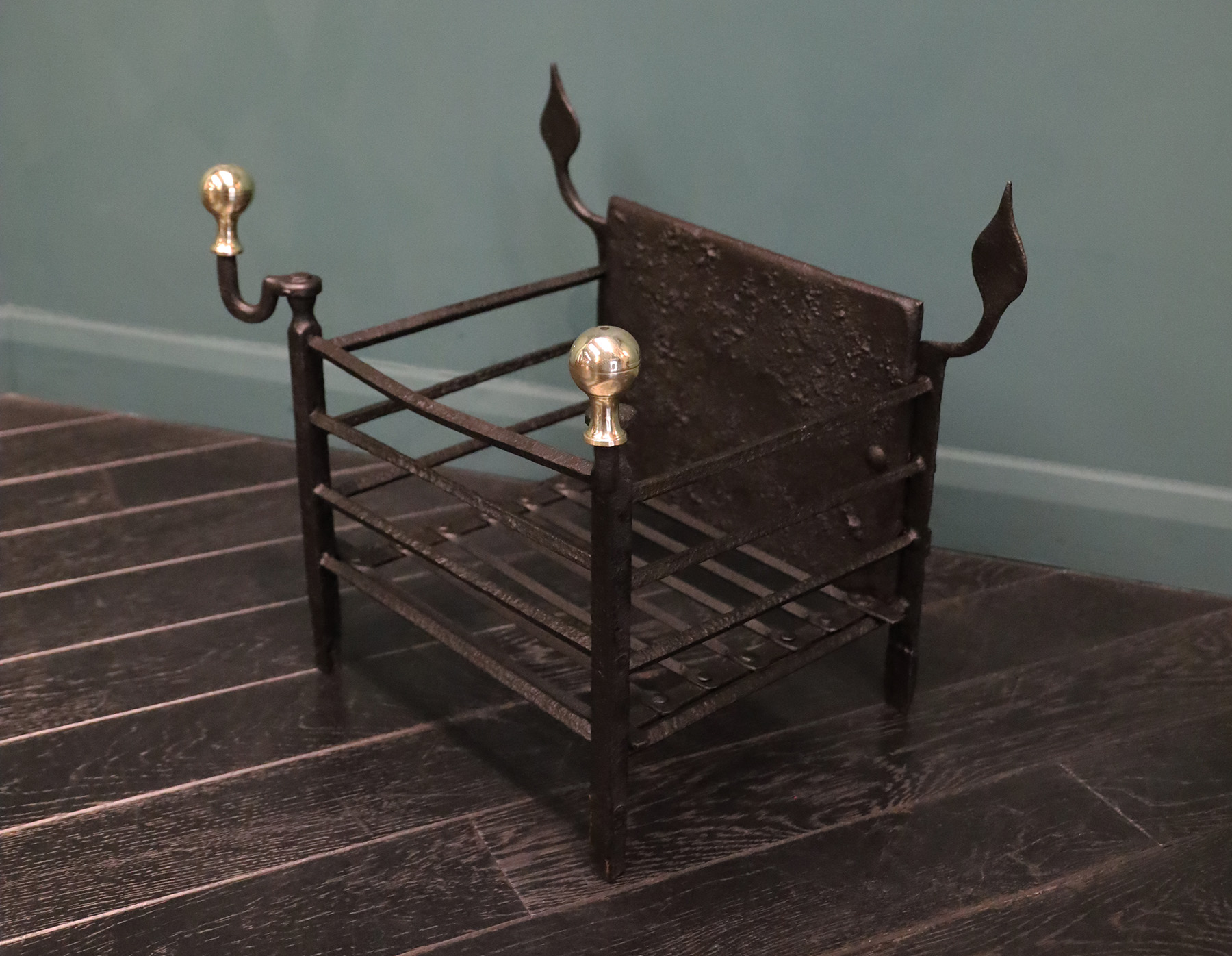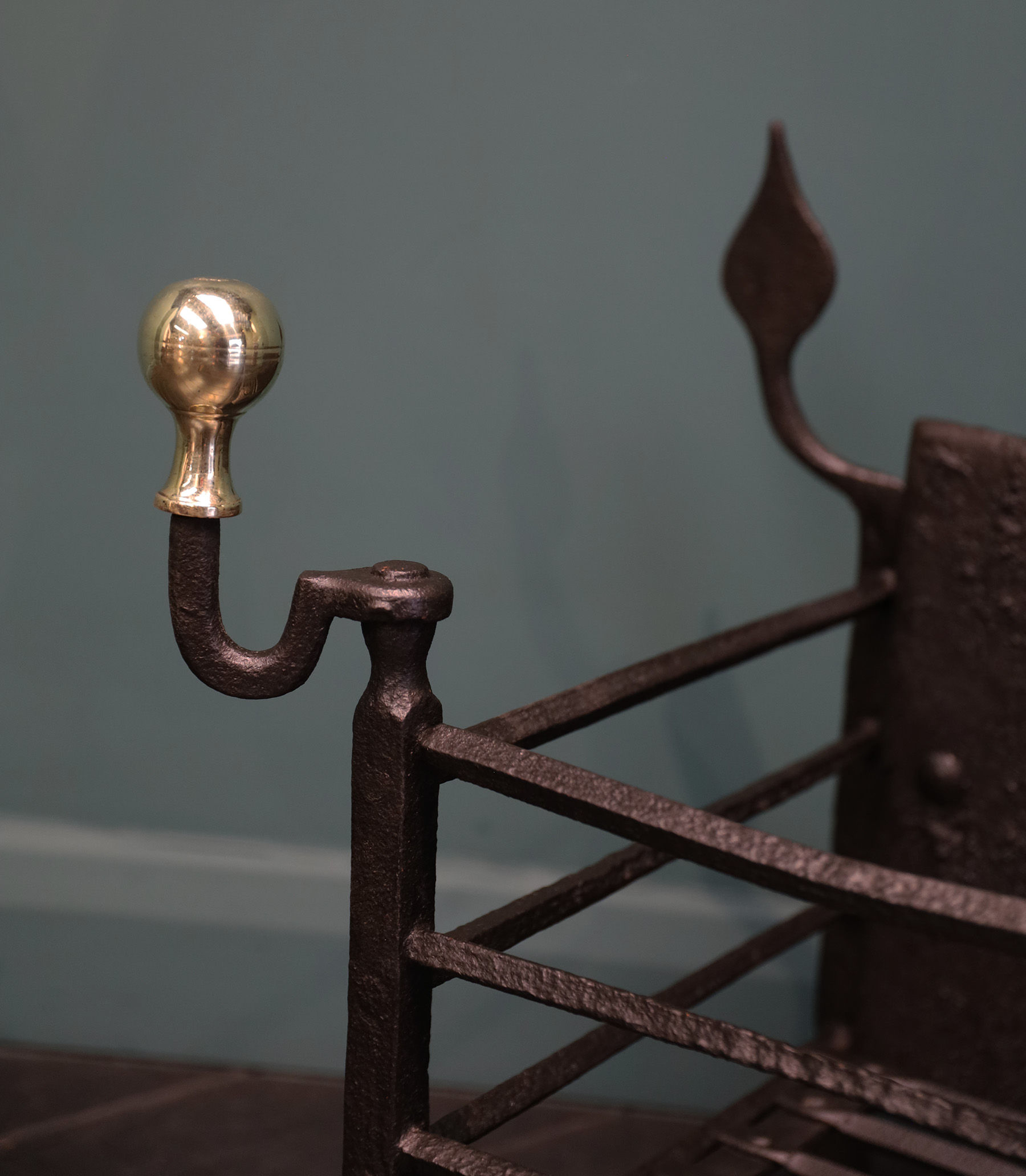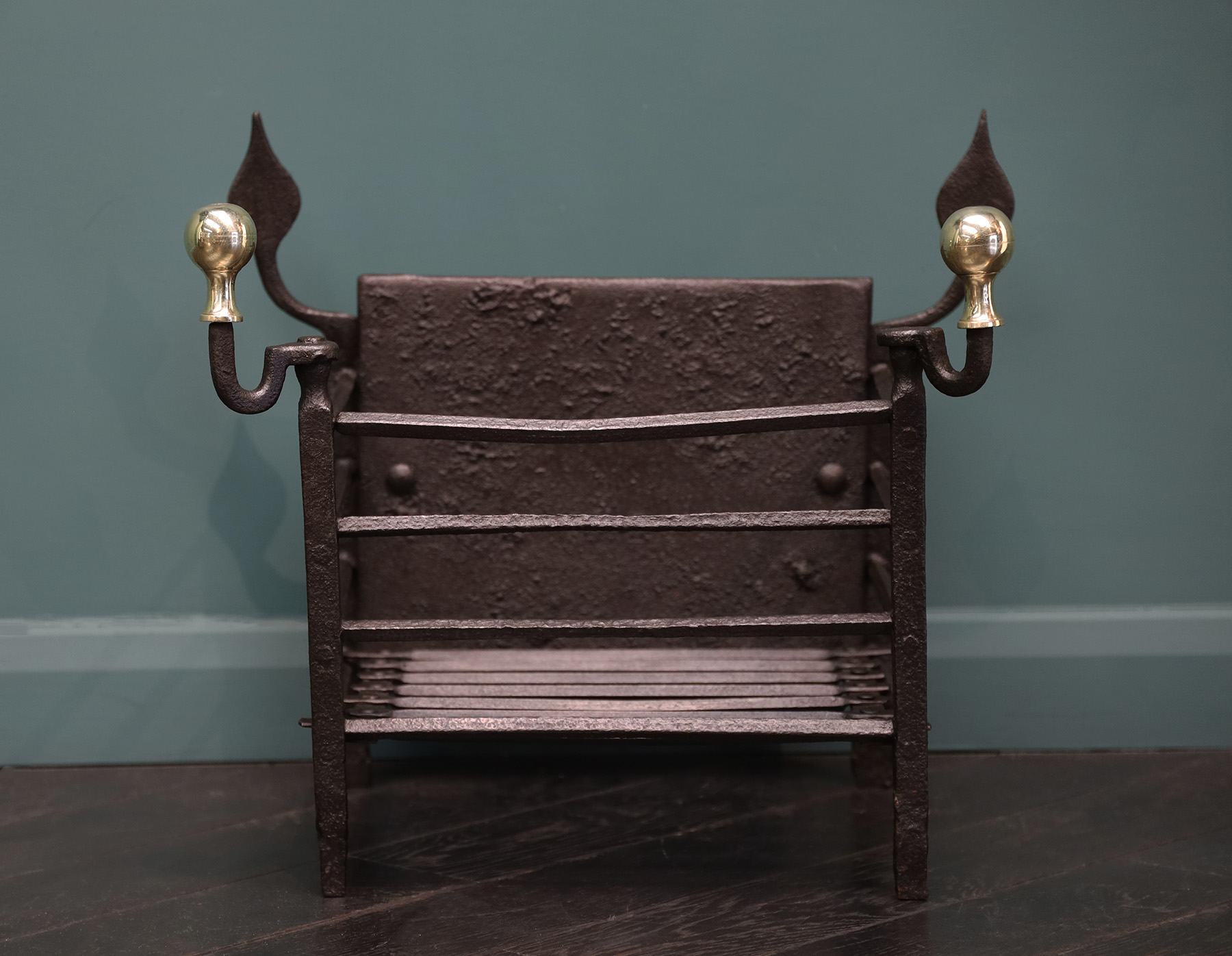 An 18th century wrought fire basket in the Dutch Manner. The railed basket is surmounted with brass knop finials at front and wrought silhouette finials at rear. Rivet-work grill and cast-iron fire back. Minor losses to rear of left-hand brass finial. Restored.