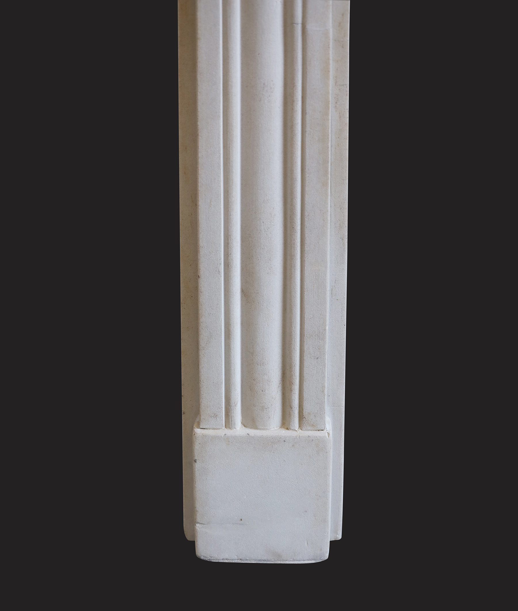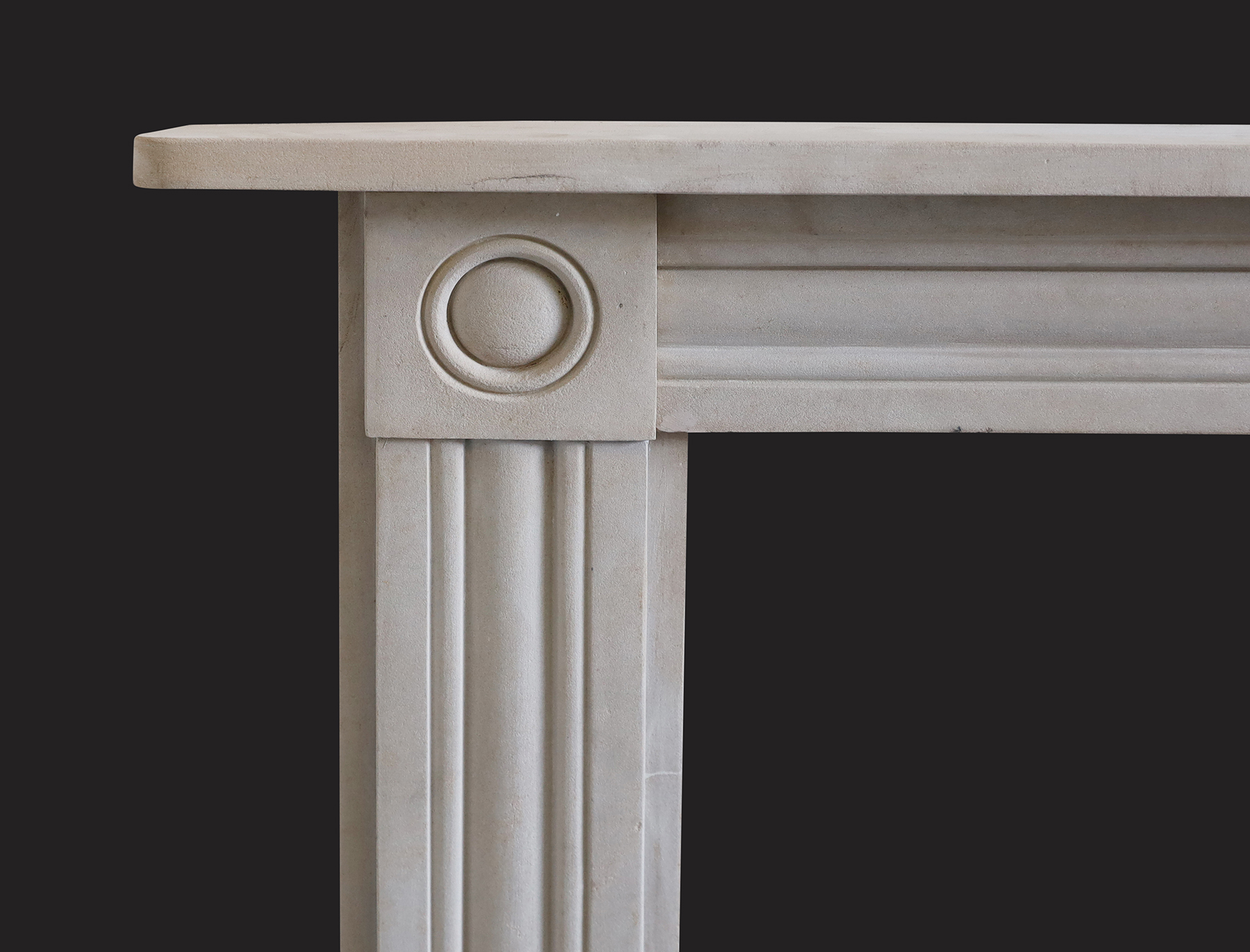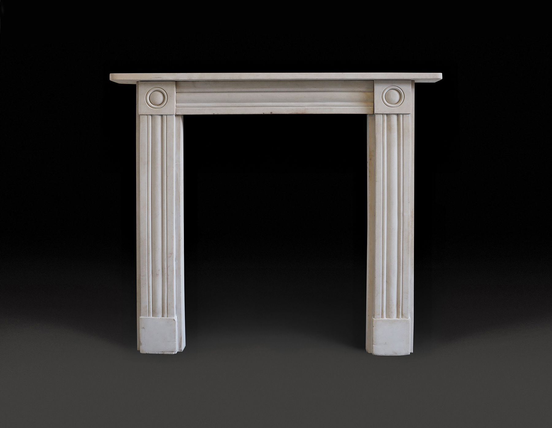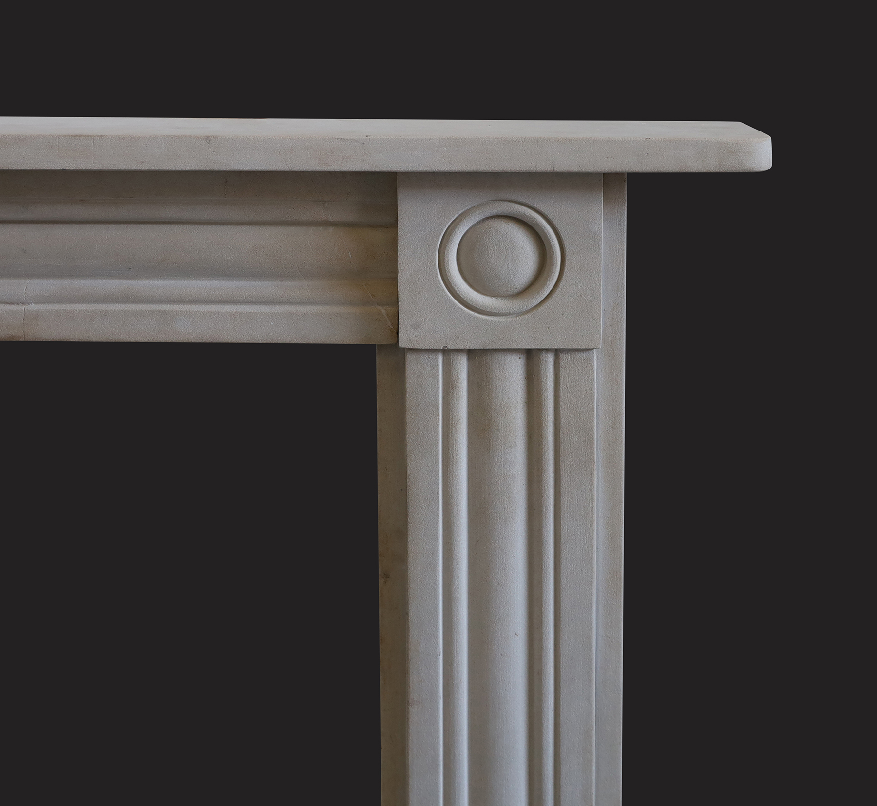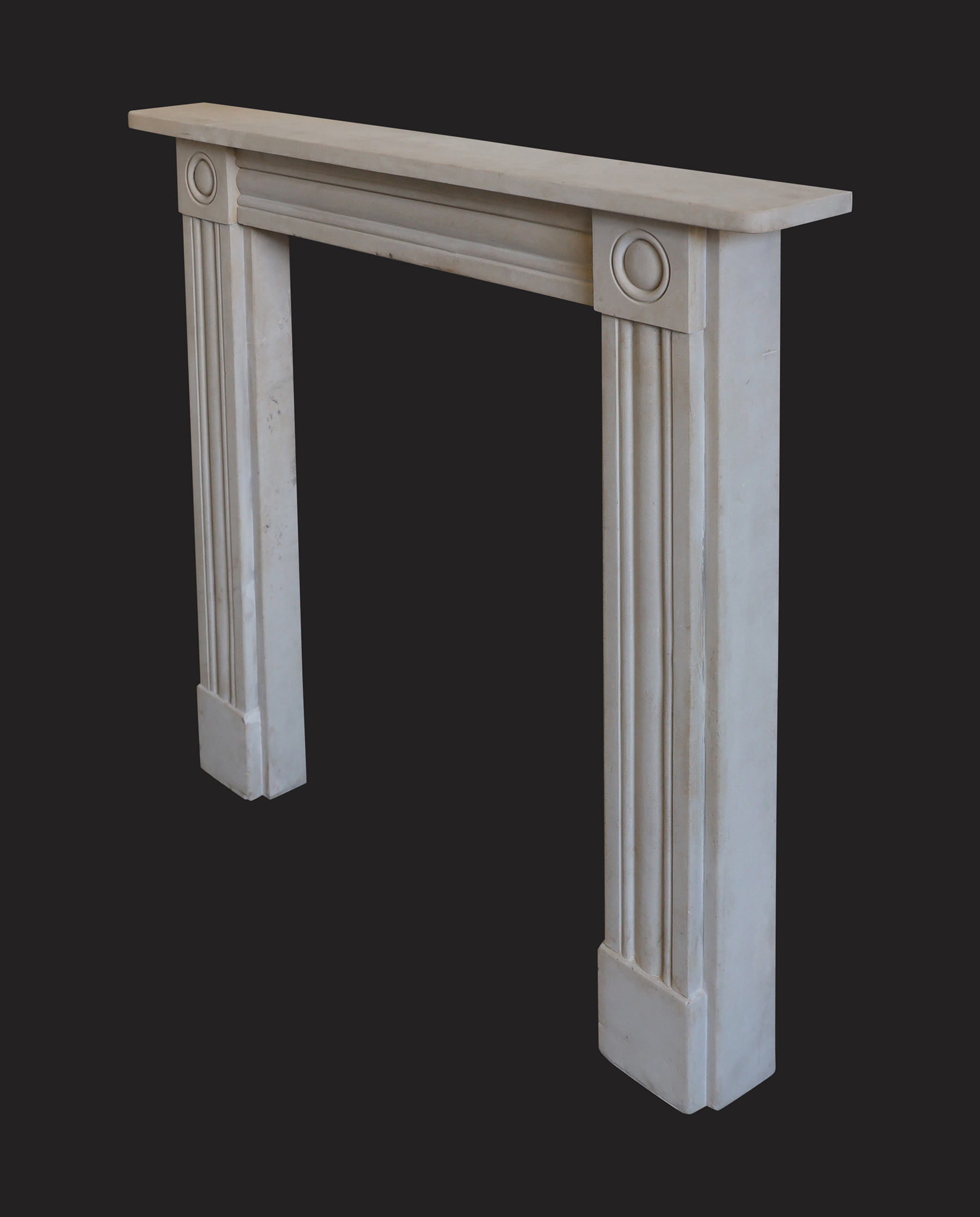 A 19th Century stone chimneypiece in the Regency manner with reeded jambs and frieze. Roundel detail to corner blocks.  Stepped plinths to meet the hearth. .  Body width: 41 3/4  Width of jamb: 7″ Restored.