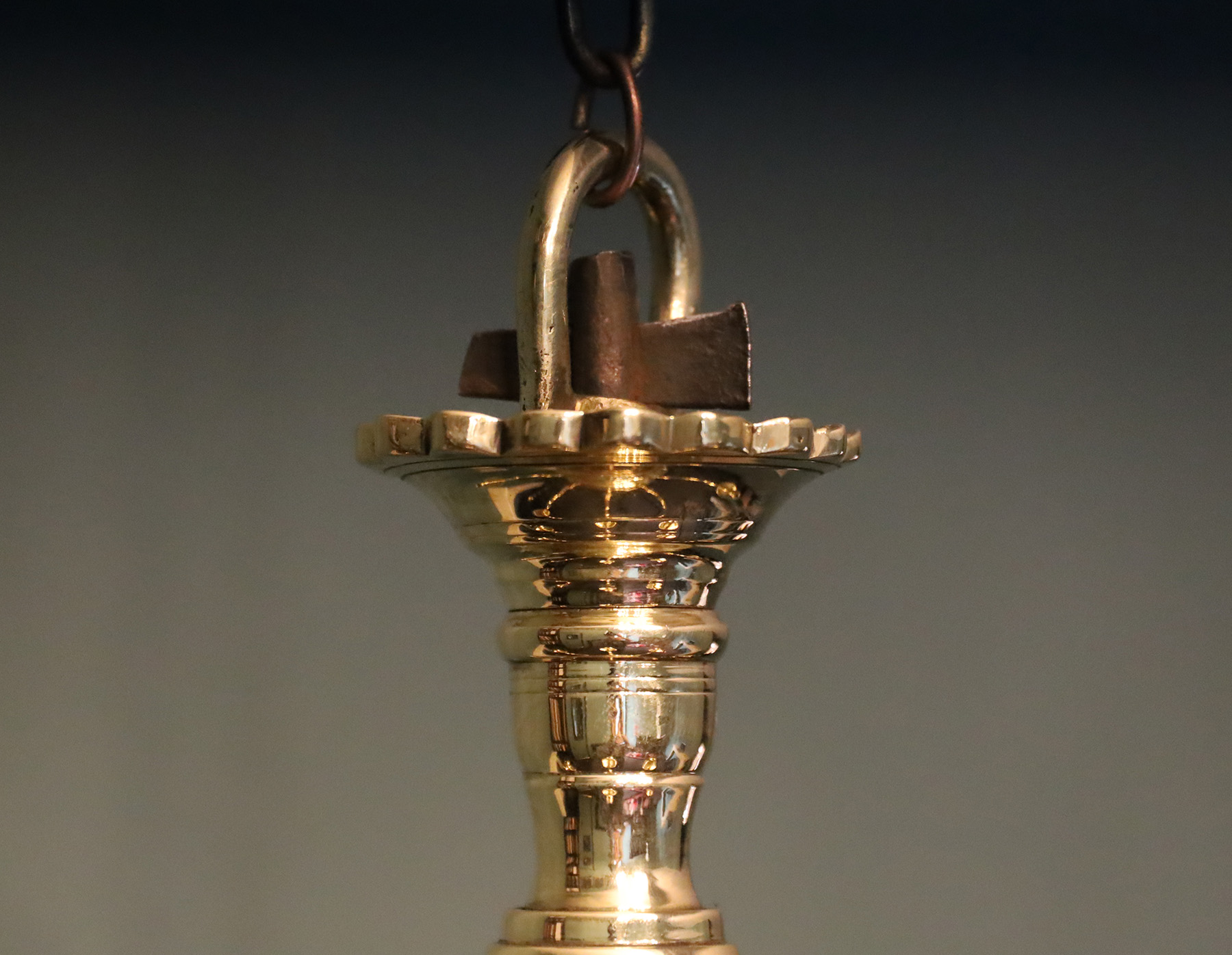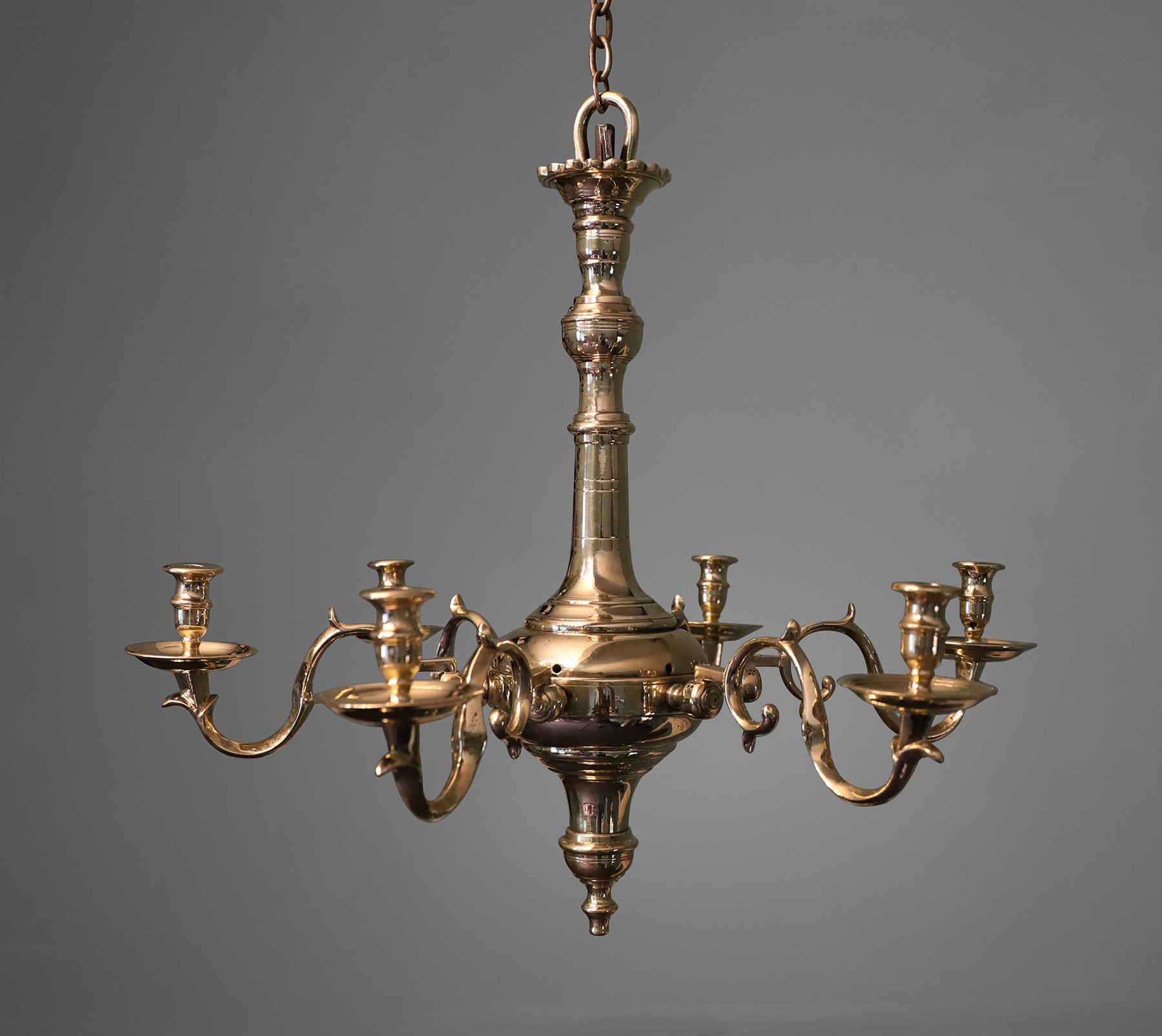 A fine early 19th century English six branch brass chandelier. The collared ring detail on the central sphere holds the branches; each s-scroll arm is individually marked and housed in mortised joint flanges extending from the central ring. All central elements are secured on a wrought-iron centre bar locked in place with a wedge-pin above a foliated ceiling rose. The chandelier was originally intended for candles. It has been previously electrified with wiring now removed. Electrification can be arranged if required. Restored.