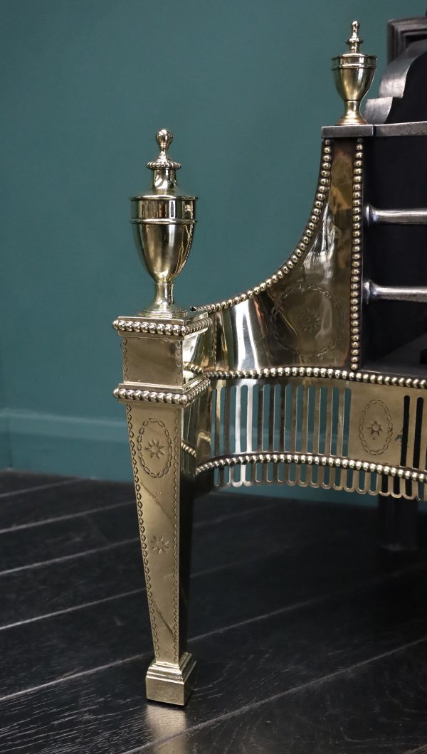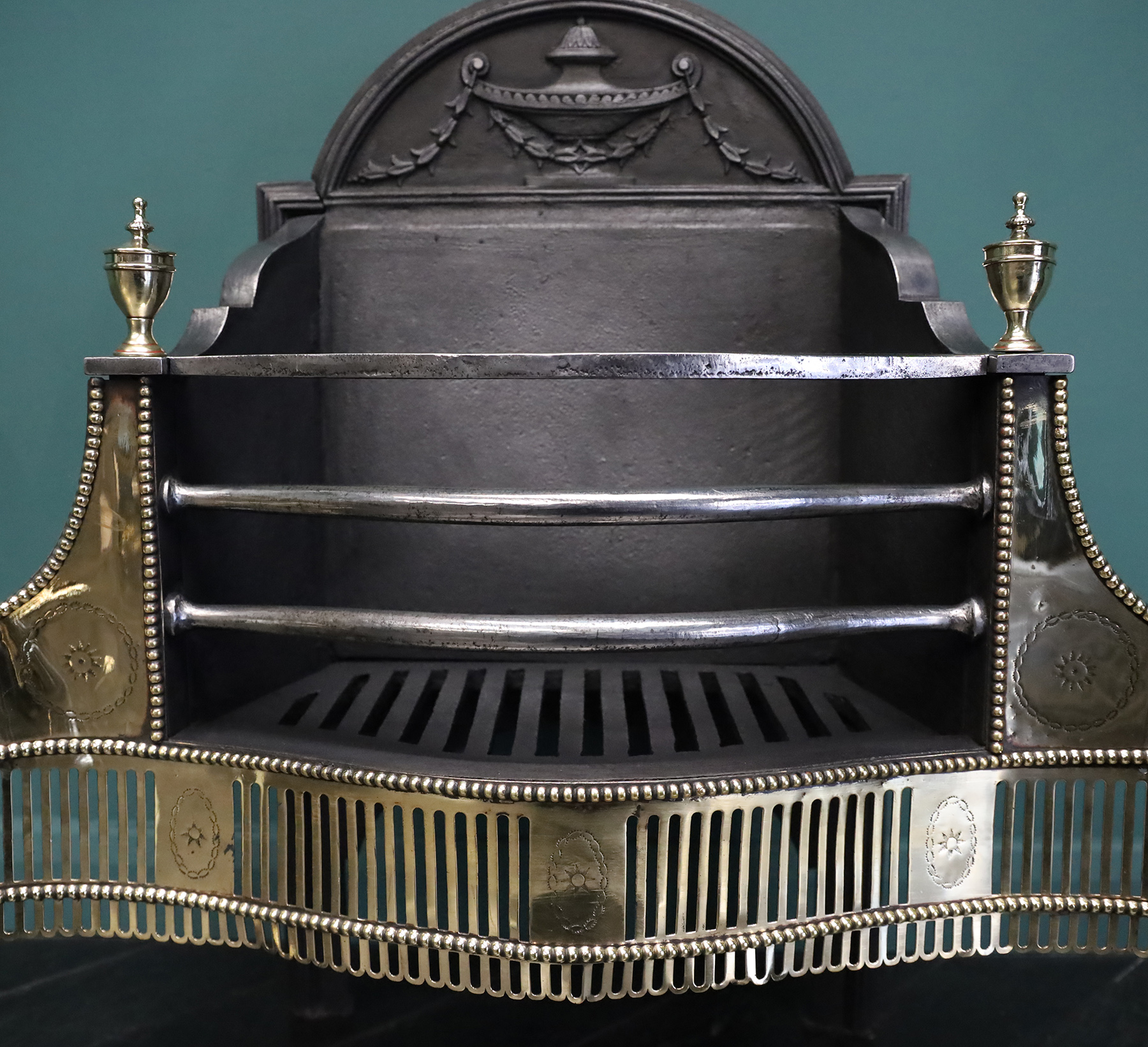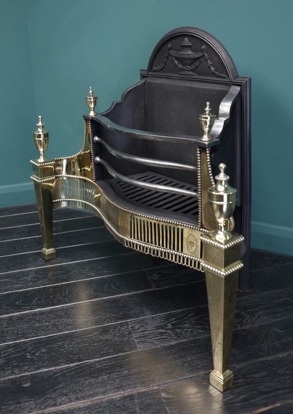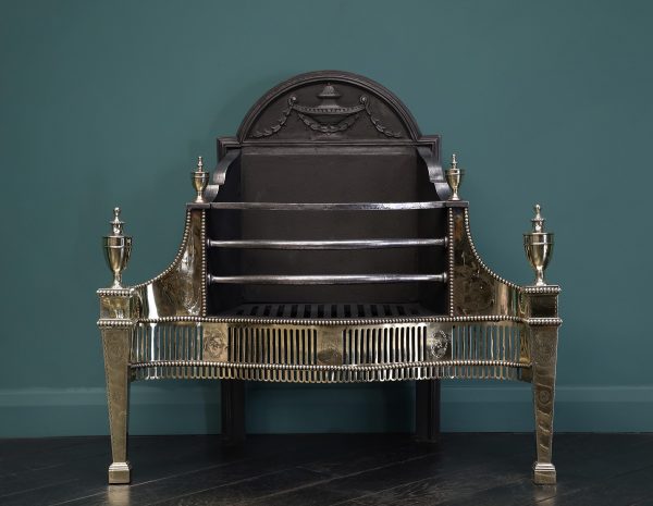 A polished brass & steel Georgian Revival fire grate by Thomas Elsley. The railed serpentine basket above a pierced fluted fret is set between square tapered legs with large brass urns. Engraving to wings, legs and fret. Wrought-iron fire bars and a decorative fireback. Restored. Height of burning area: 11″.