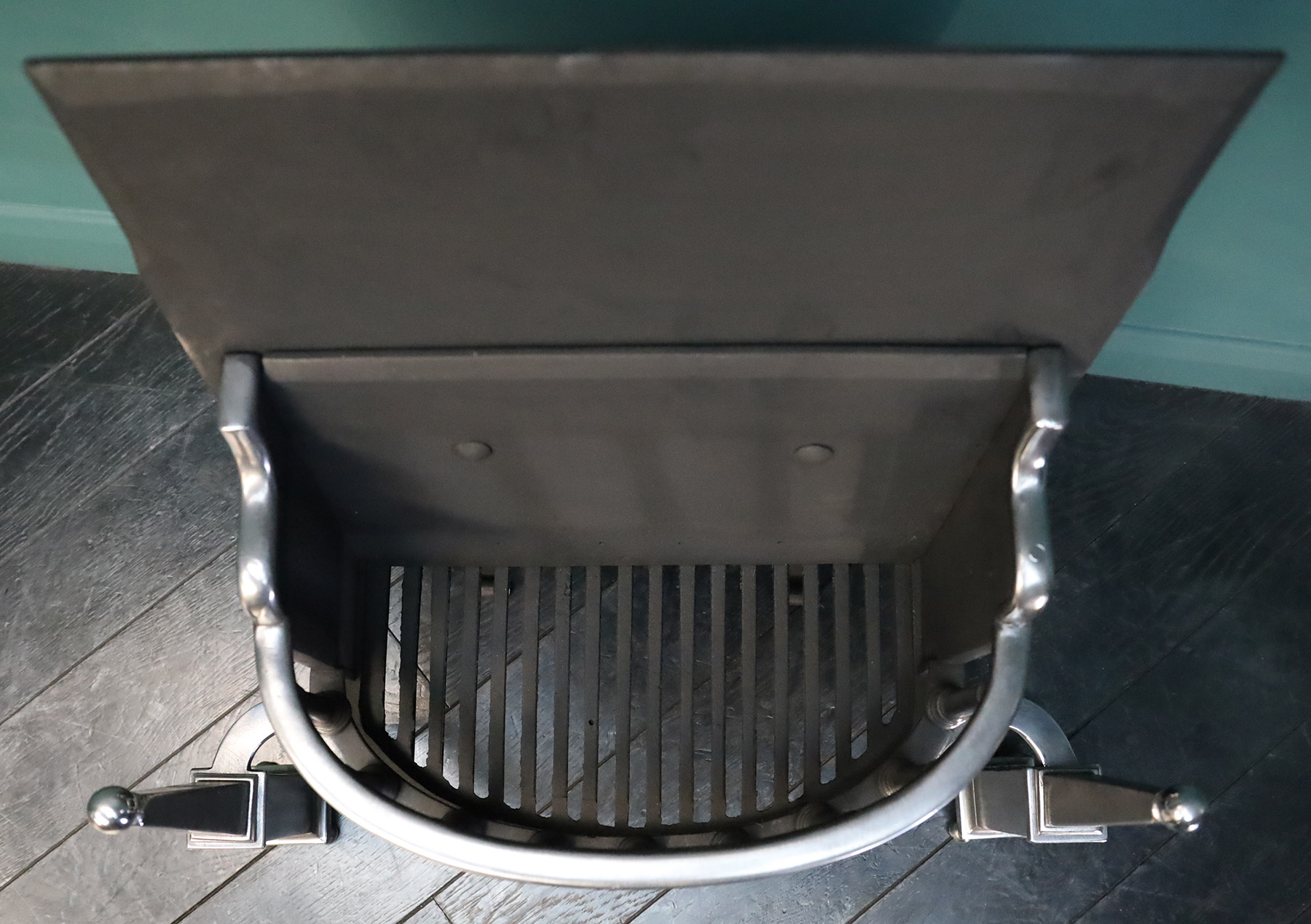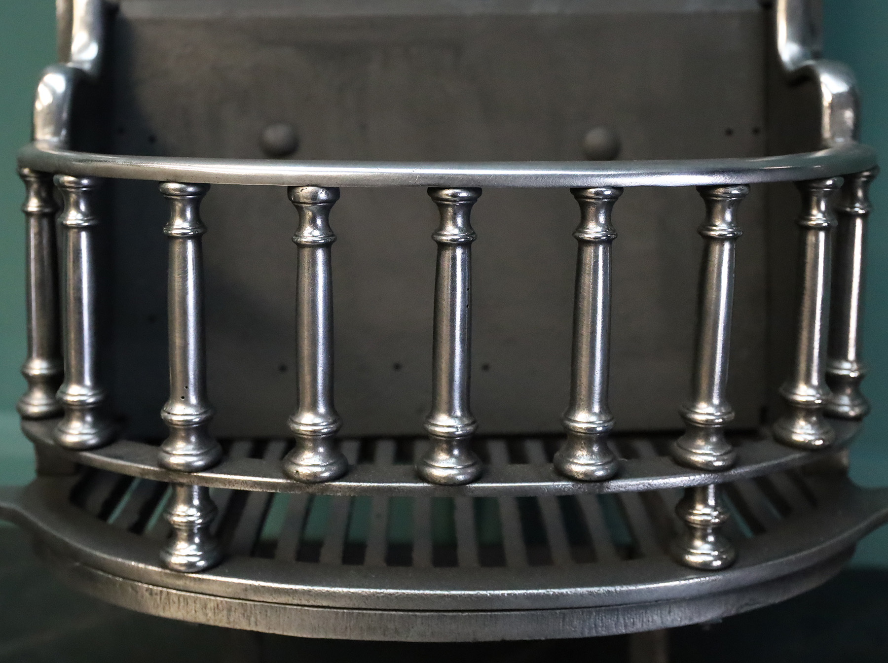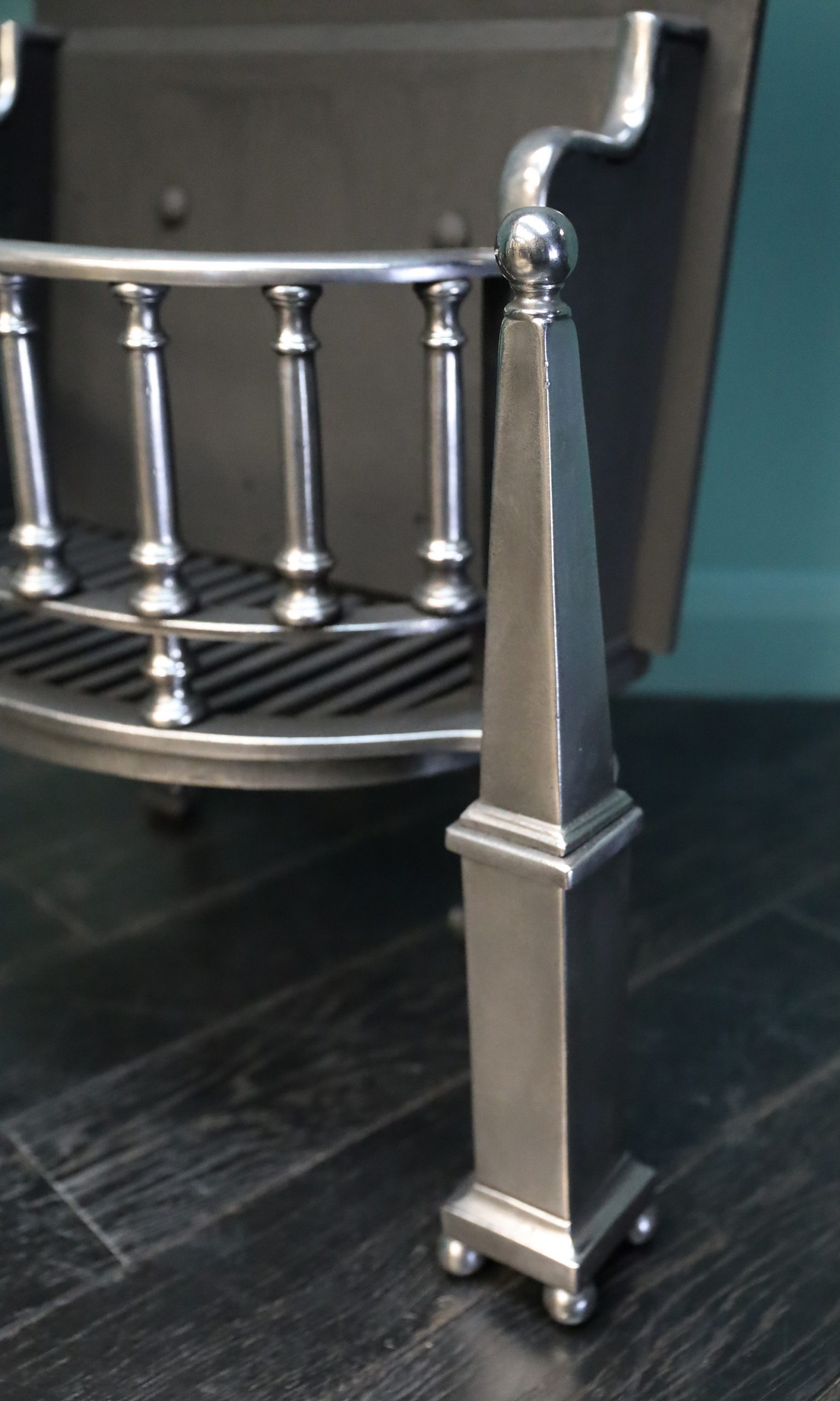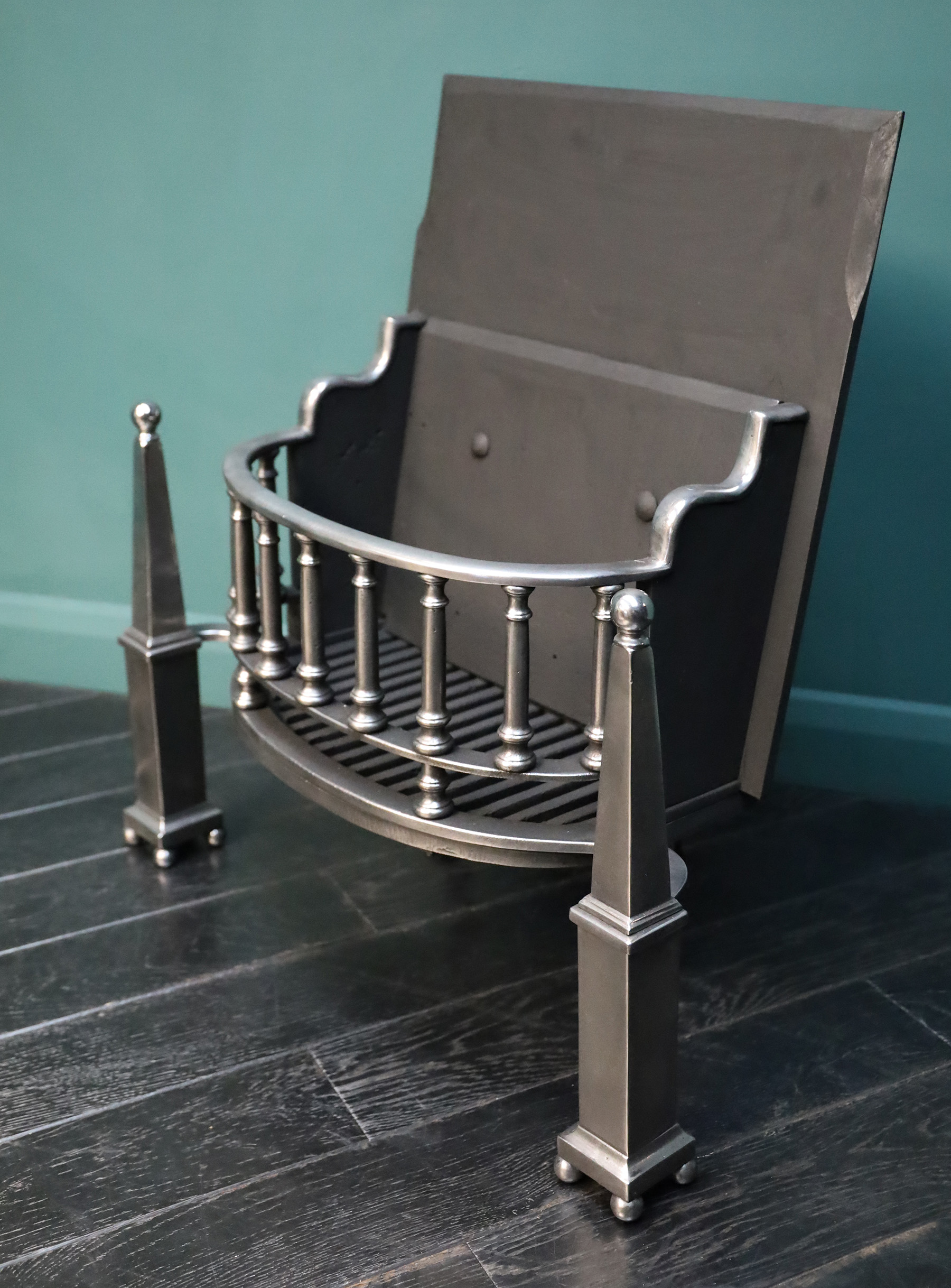 A polished steel bow-fronted fire grate with pinnacle finials. The fire grate with turned vertical balustrade fire bars set between square and tapered column standards on ball-feet. A early twentieth century version of an early eighteenth century form. Height of burning area: 7 3/4″ Width at rear: 18 1/2″. Restored.