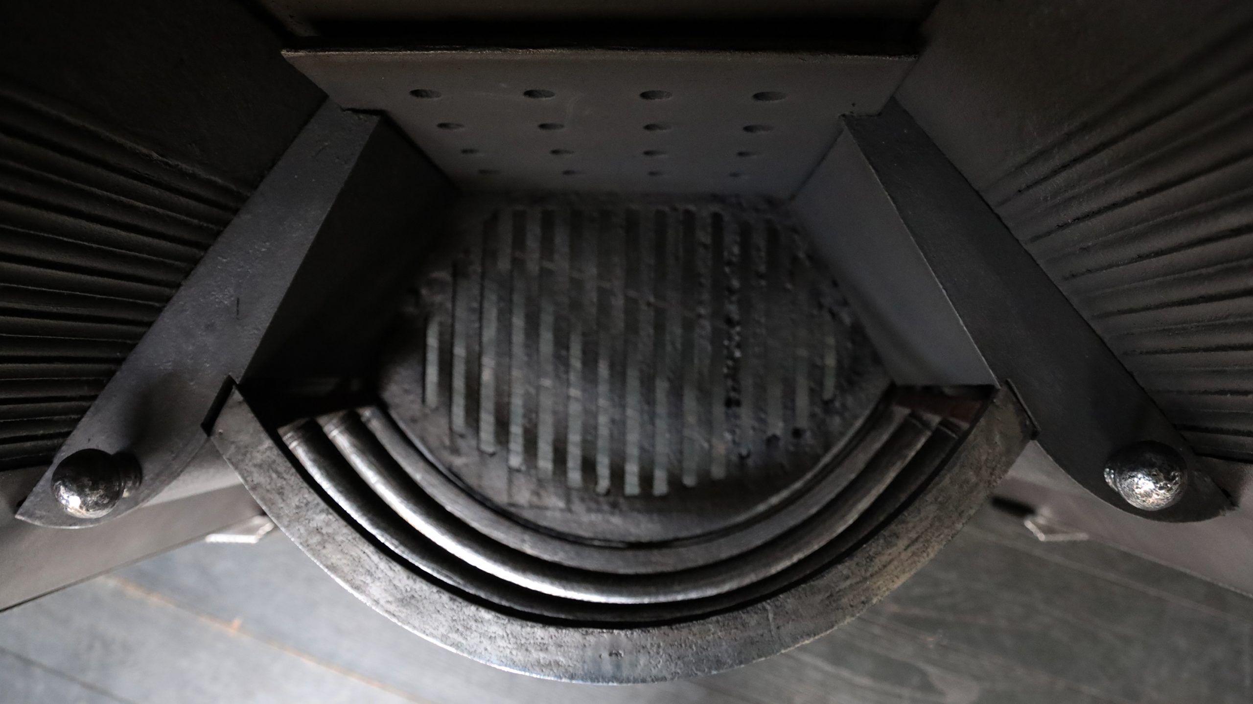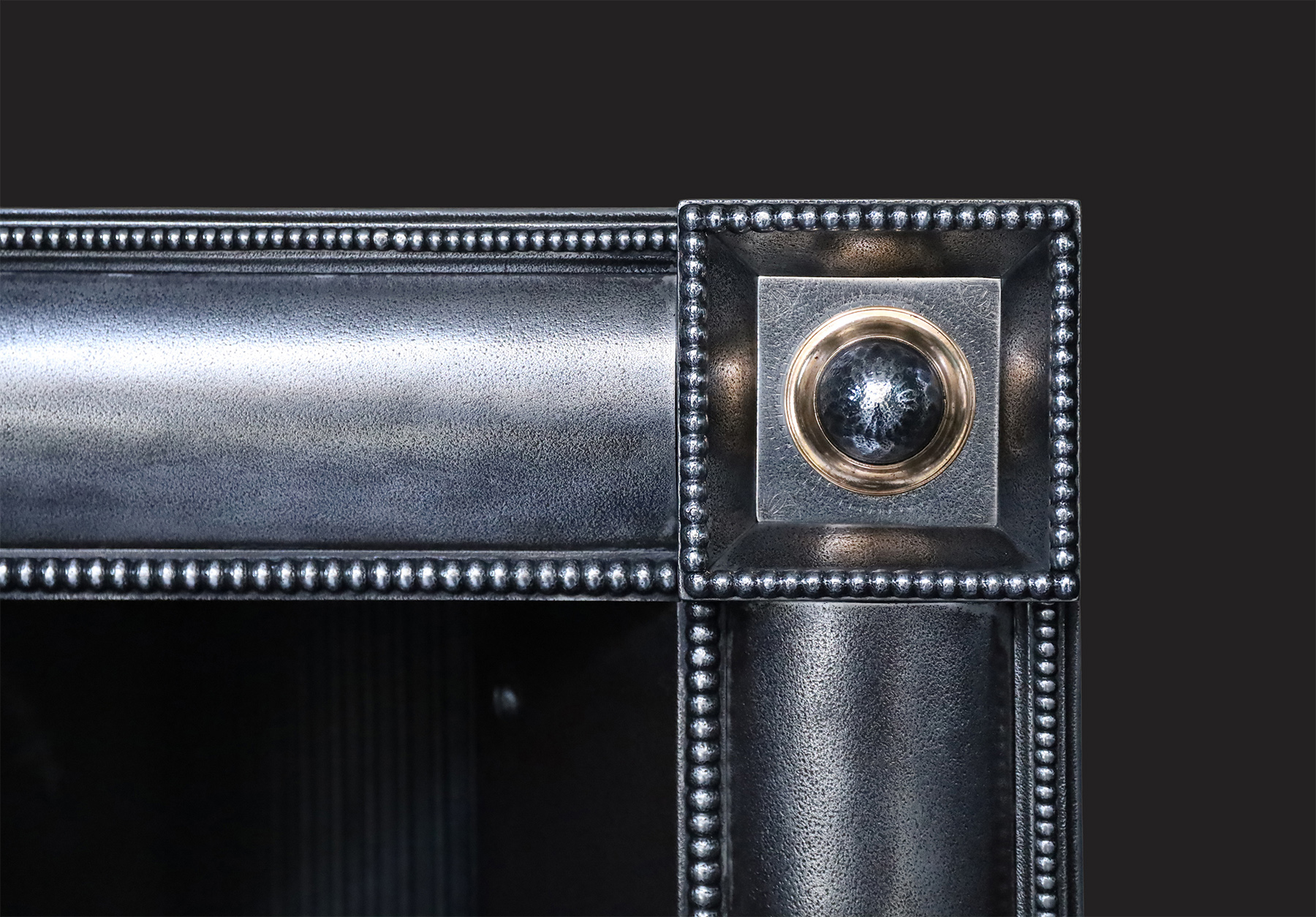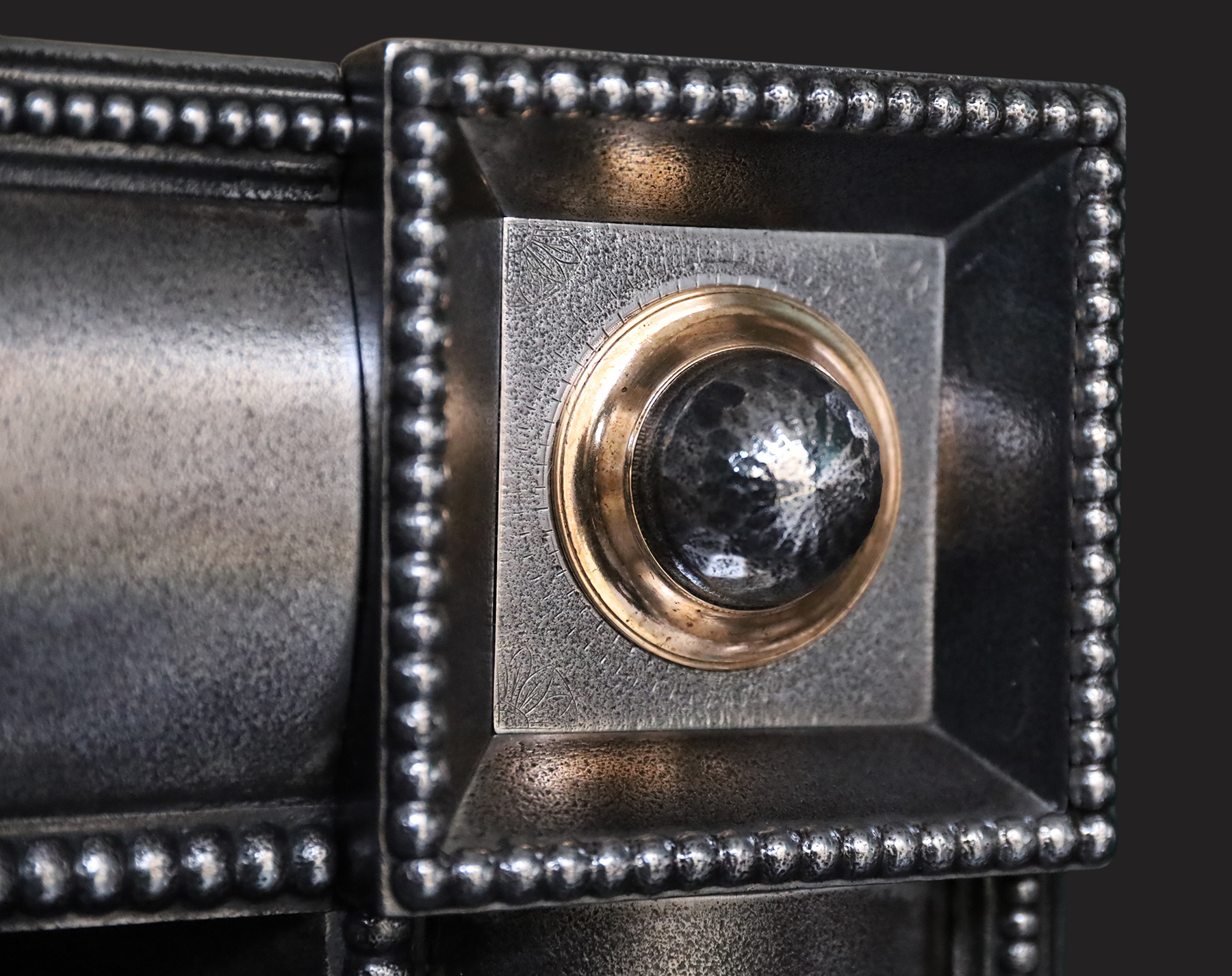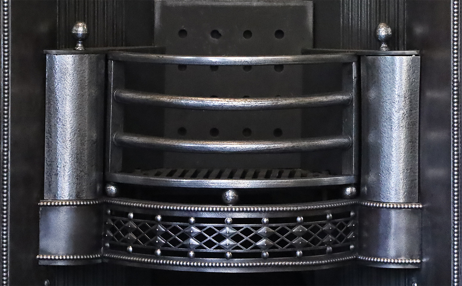 A fine polished wrought Regency register grate. The semi-circular railed basket with ball finials set over a geometric latticework fret. The front surround comprises of polished convex sections, echoed in the hob fronts. Beaded moulding frames all the outer sections with beautiful segmented spheres encapulated with brass collar to recessed engraved corner blocks. A shaped cast-iron fire chamber. Restored. Circa 1820