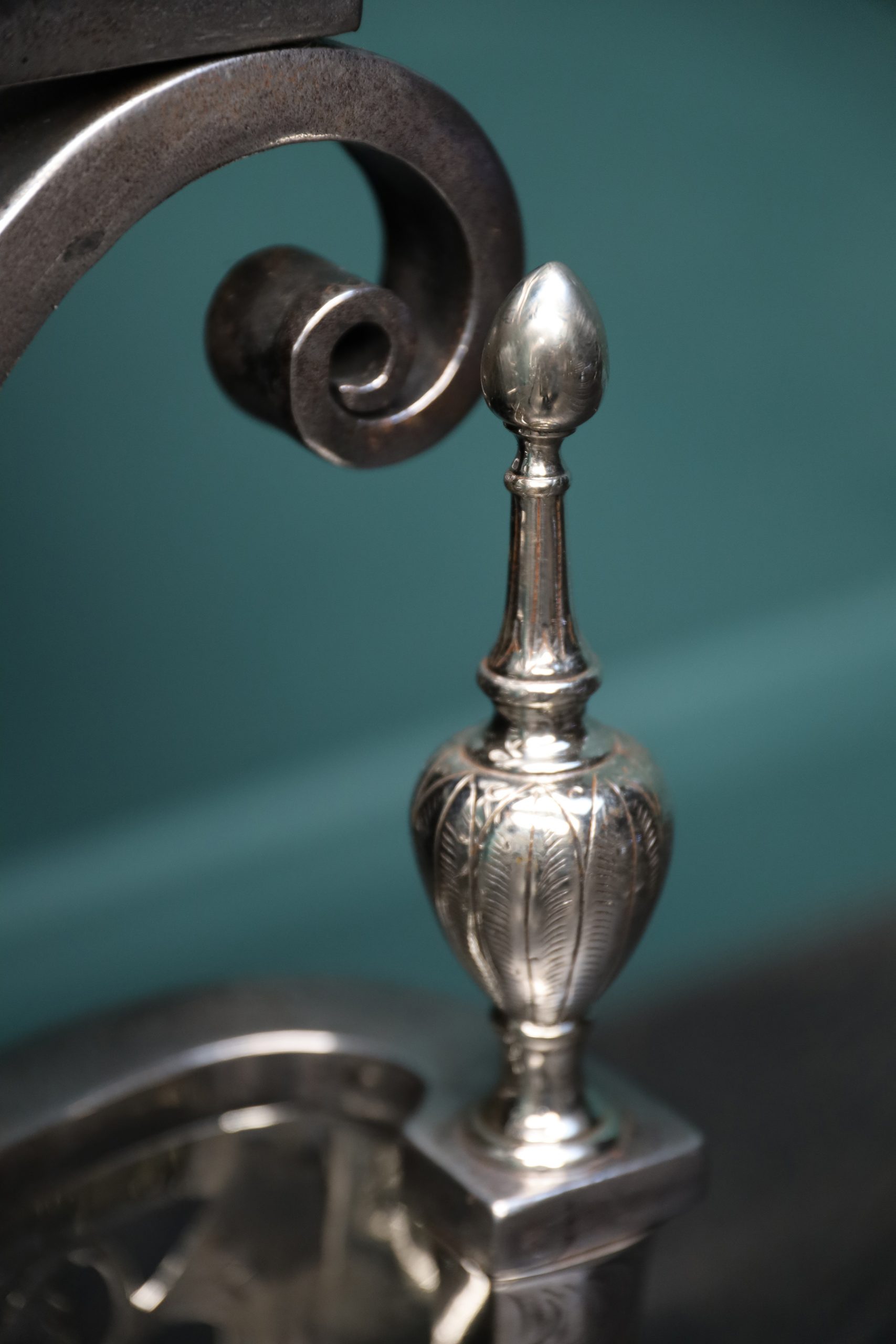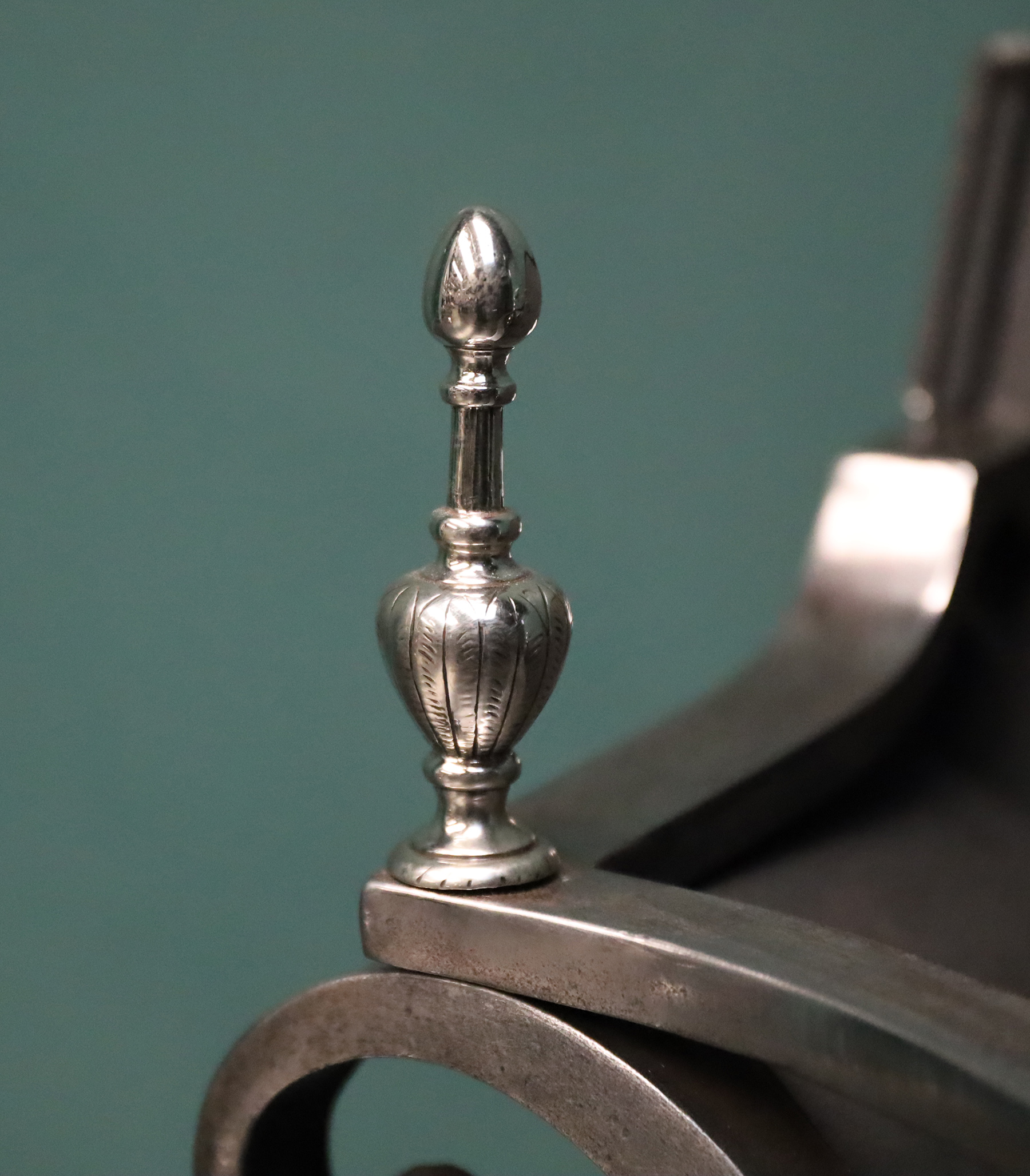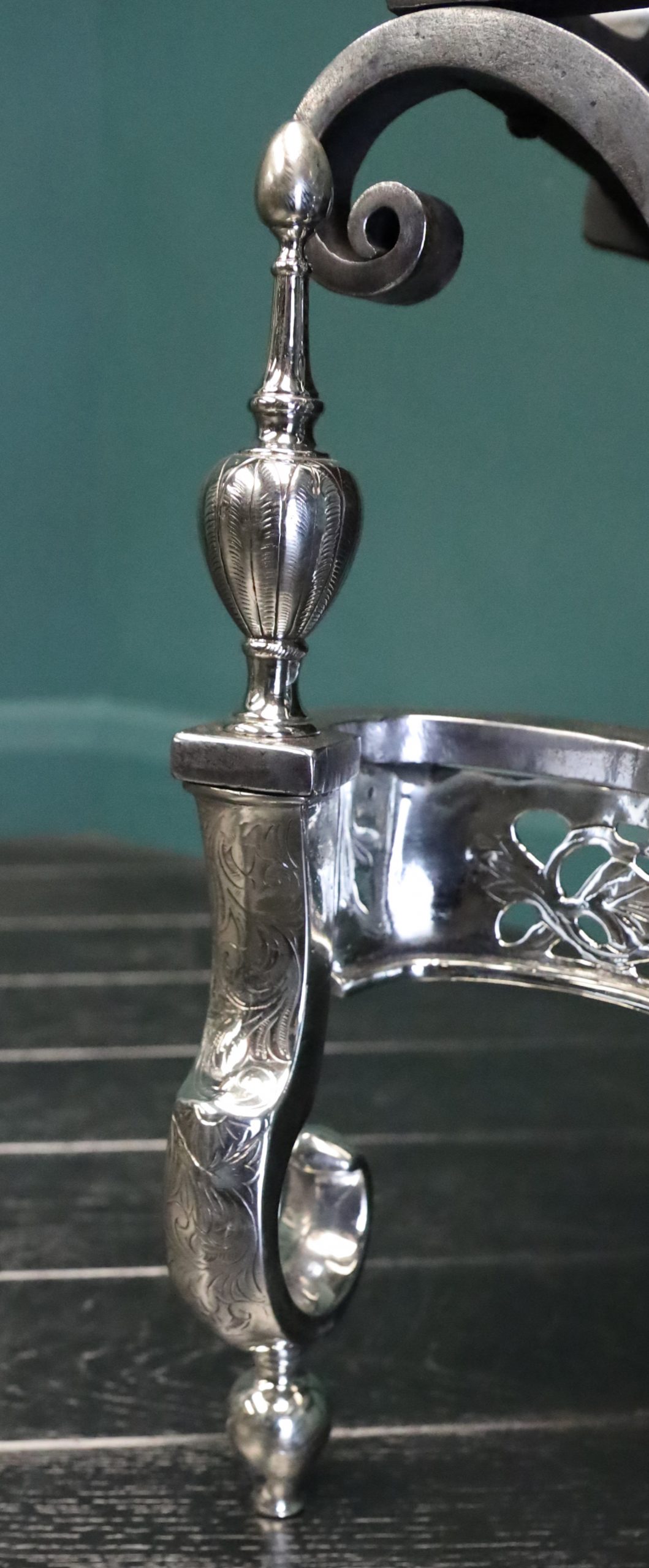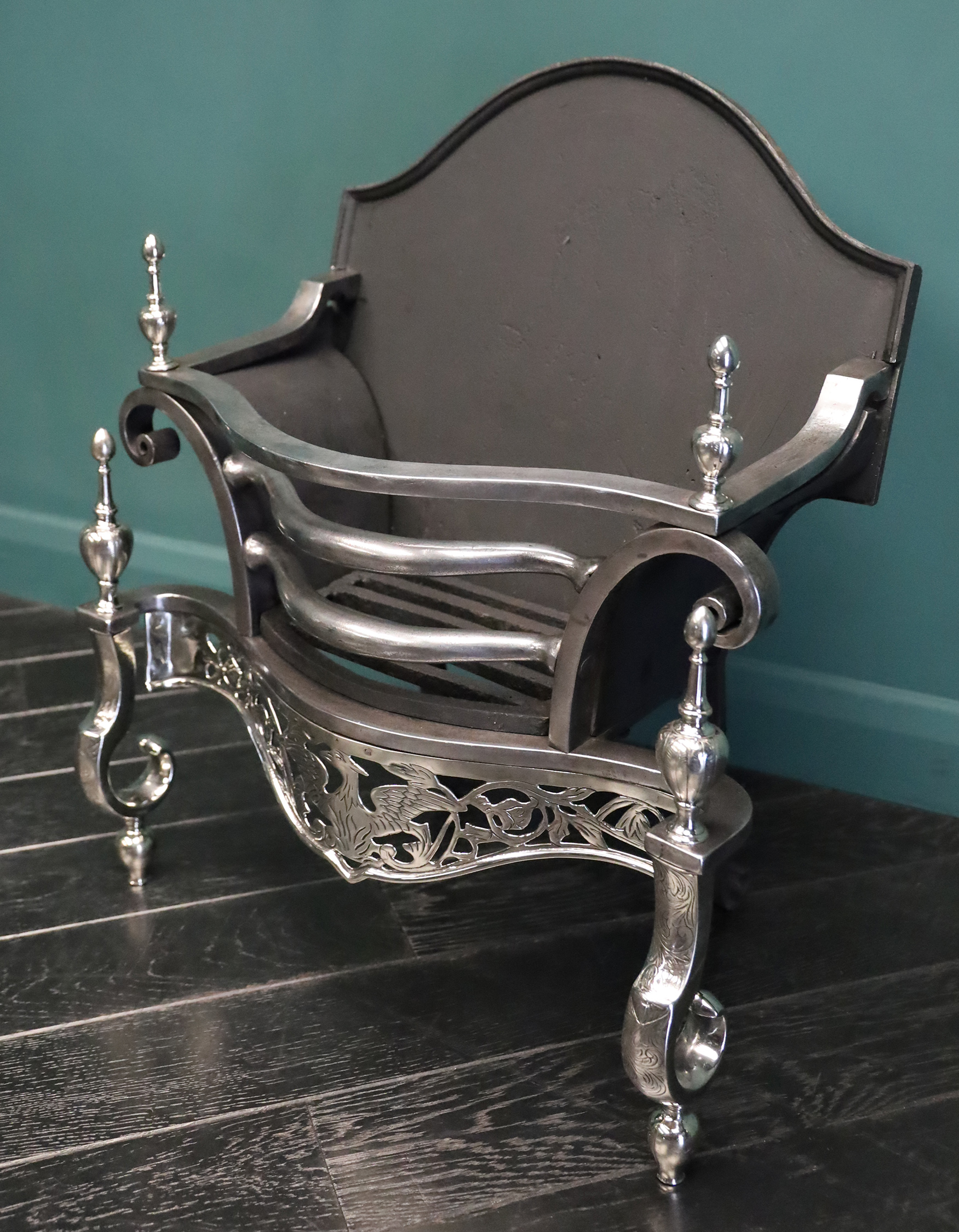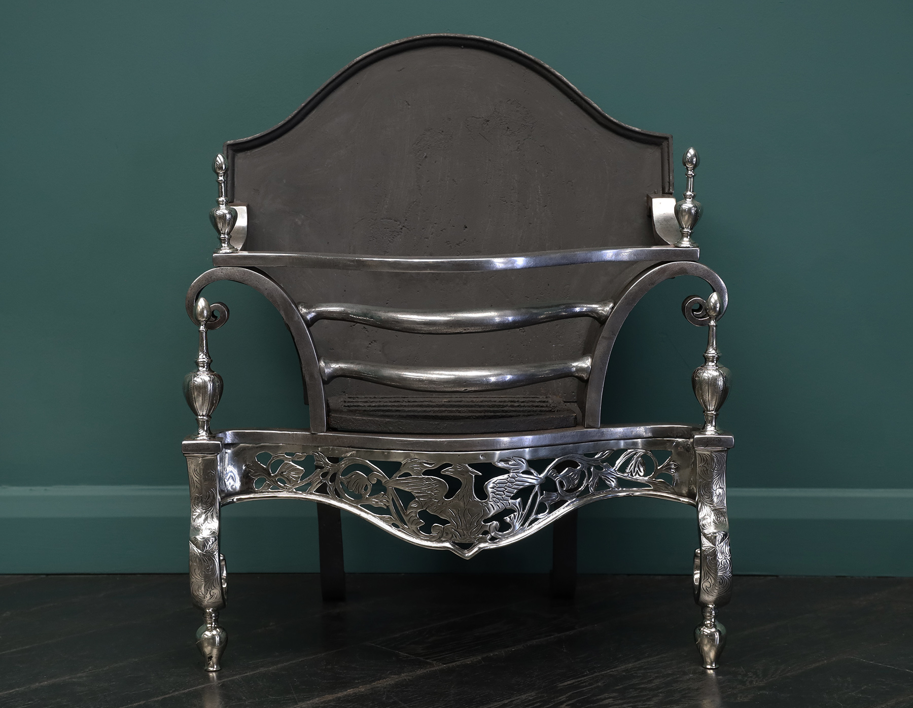 An English nickel and steel fire grate with openwork fret depicting a central Phoenix with surrounding foliage. Fine engraving to fret, break legs and urn finials. Finials sit over scrolls with shaped cast-iron fire back at rear. Height of burning area: 9 1/2″ Restored. Circa 1900