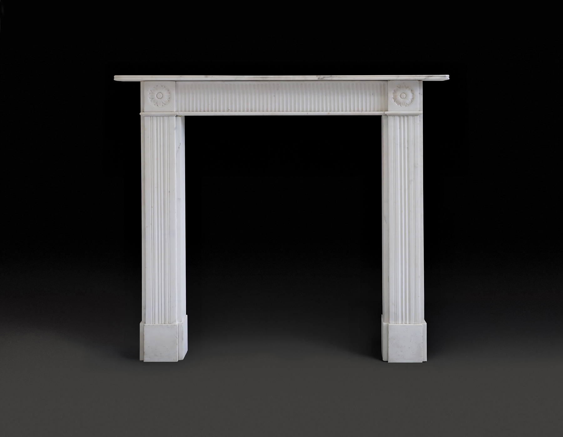 An English Regency statuary chimneypiece, the rectangular shelf with light veining and moulded reeded edge, above a vertical reeded frieze, flanked by corner blocks with finely carved floral roundels above a stepped bullnose moulding. The bullnose moulding is repeated under the frieze. The reeded jambs stand on stepped plinths. Wear consistent with age. Fully restored.