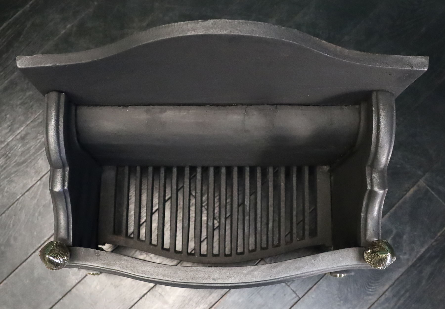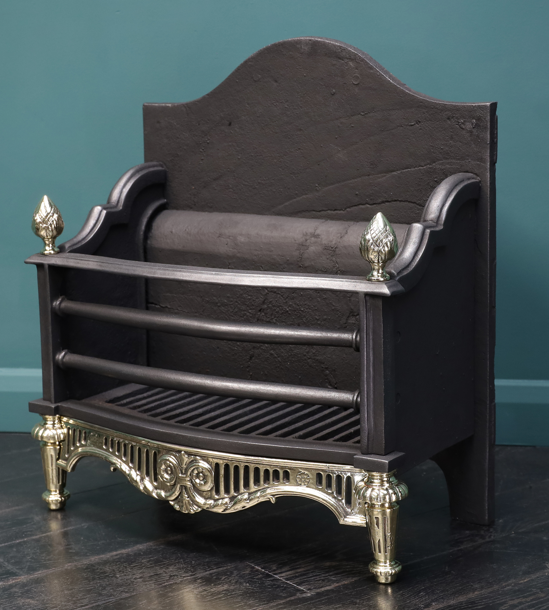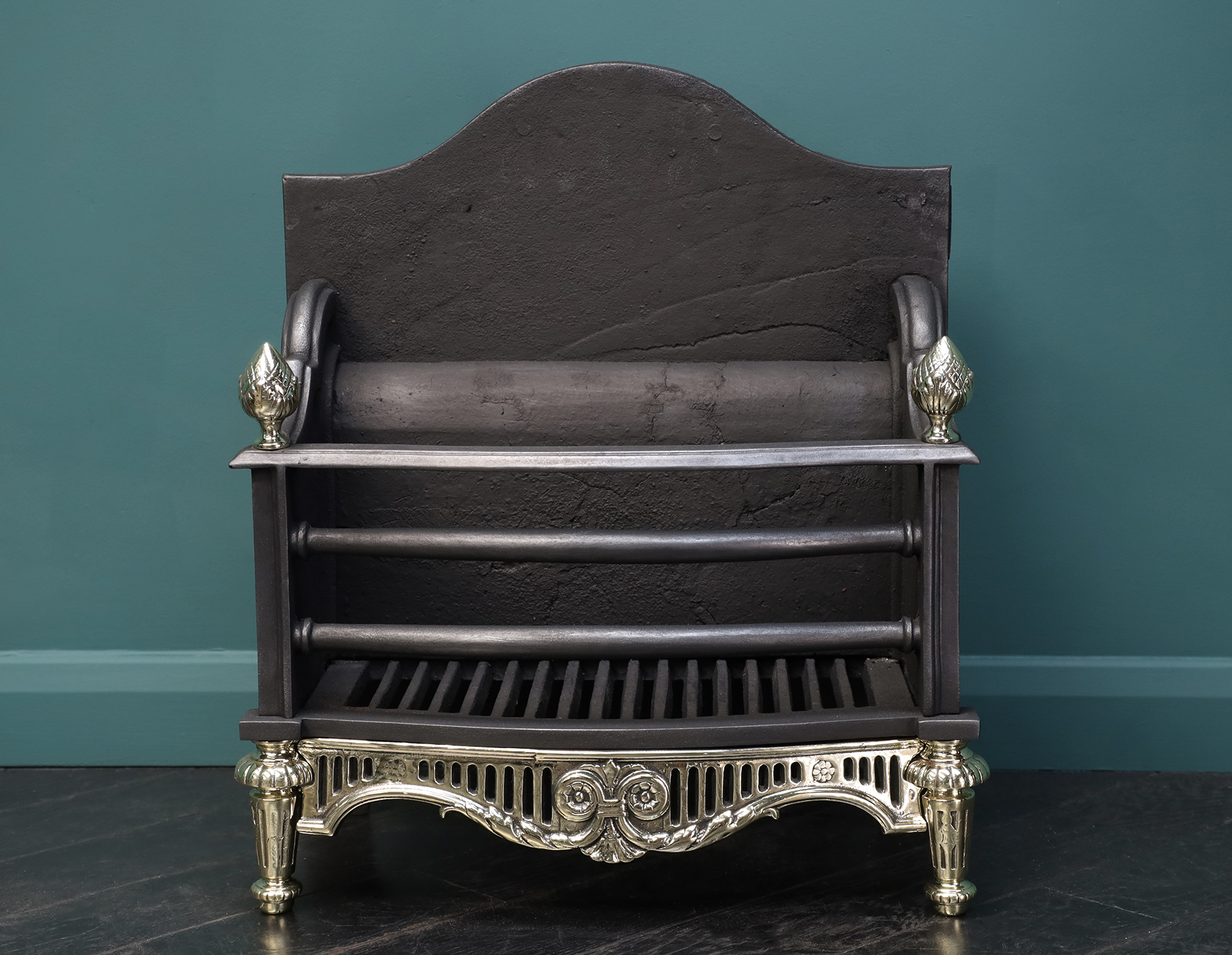 A sturdy brass and iron fireplace fire basket. The black-iron fire bars with collar detail over a shaped fluted brass fret with central scrollwork, supported on brass legs and acorn finials uppermost. A gently arched fire back with integrated fire brick. Restored.