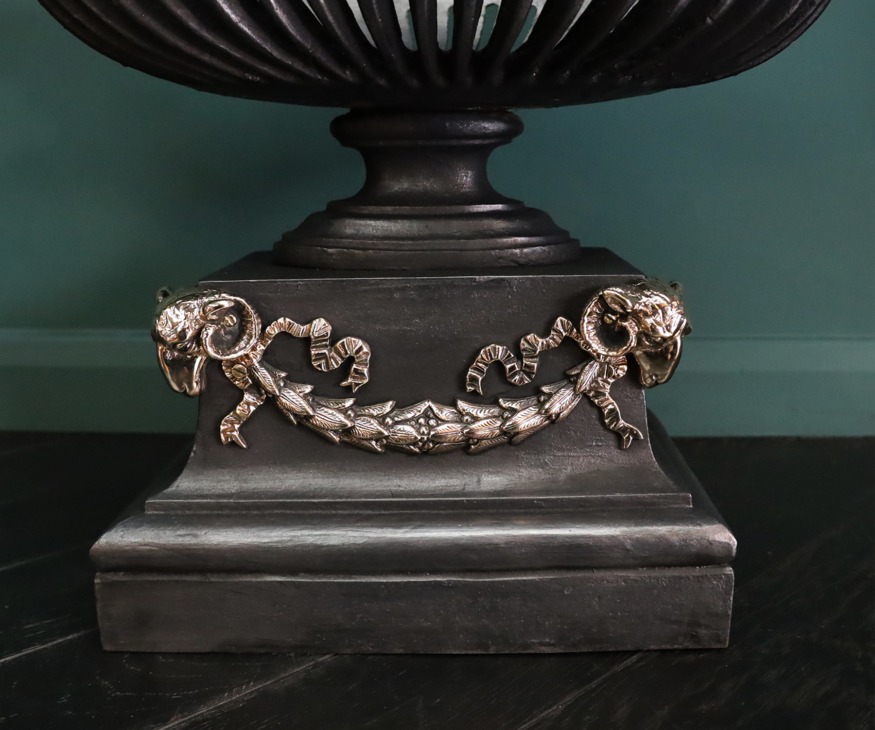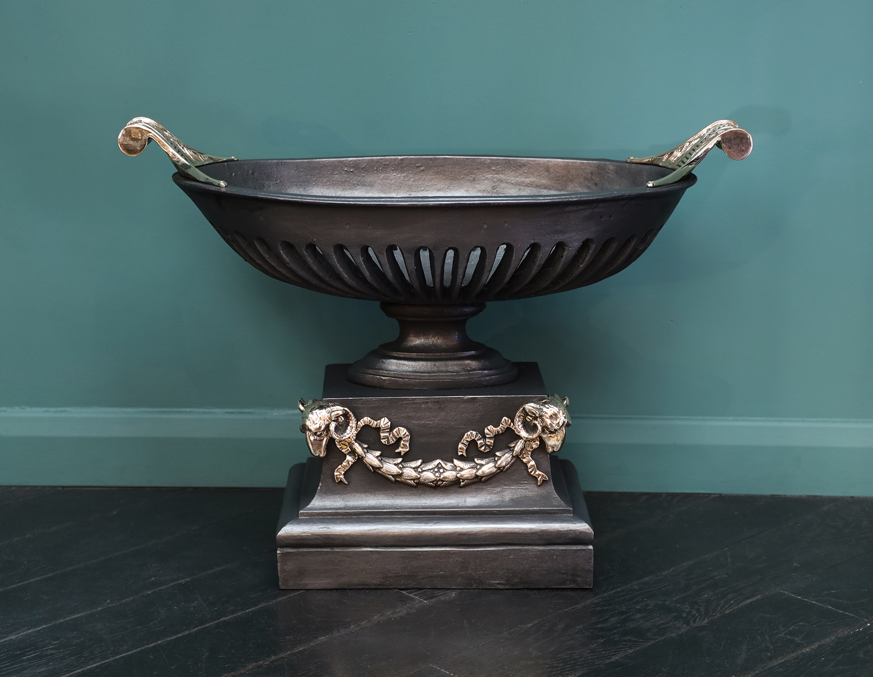 Bronze & cast-iron urn grate in the Regency manner. The urn in iron with bronze scrolled handles and swag and rams heads details to plinth. Height of burning area: 13″ Restored. Circa 1900