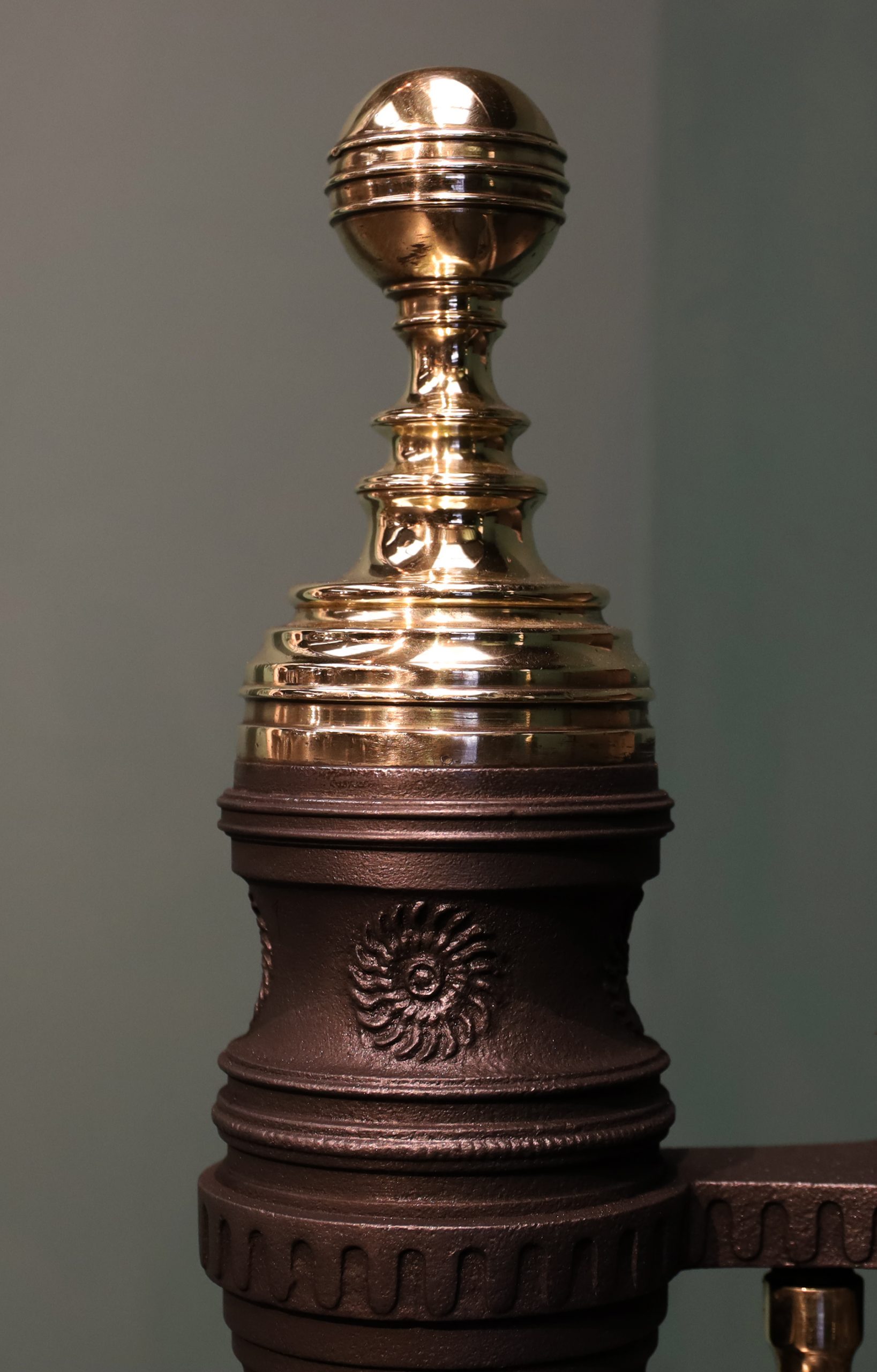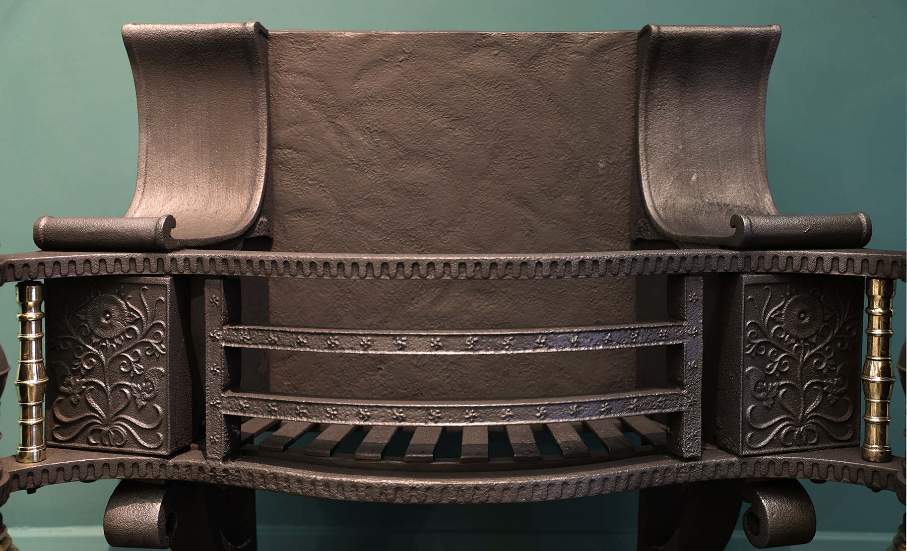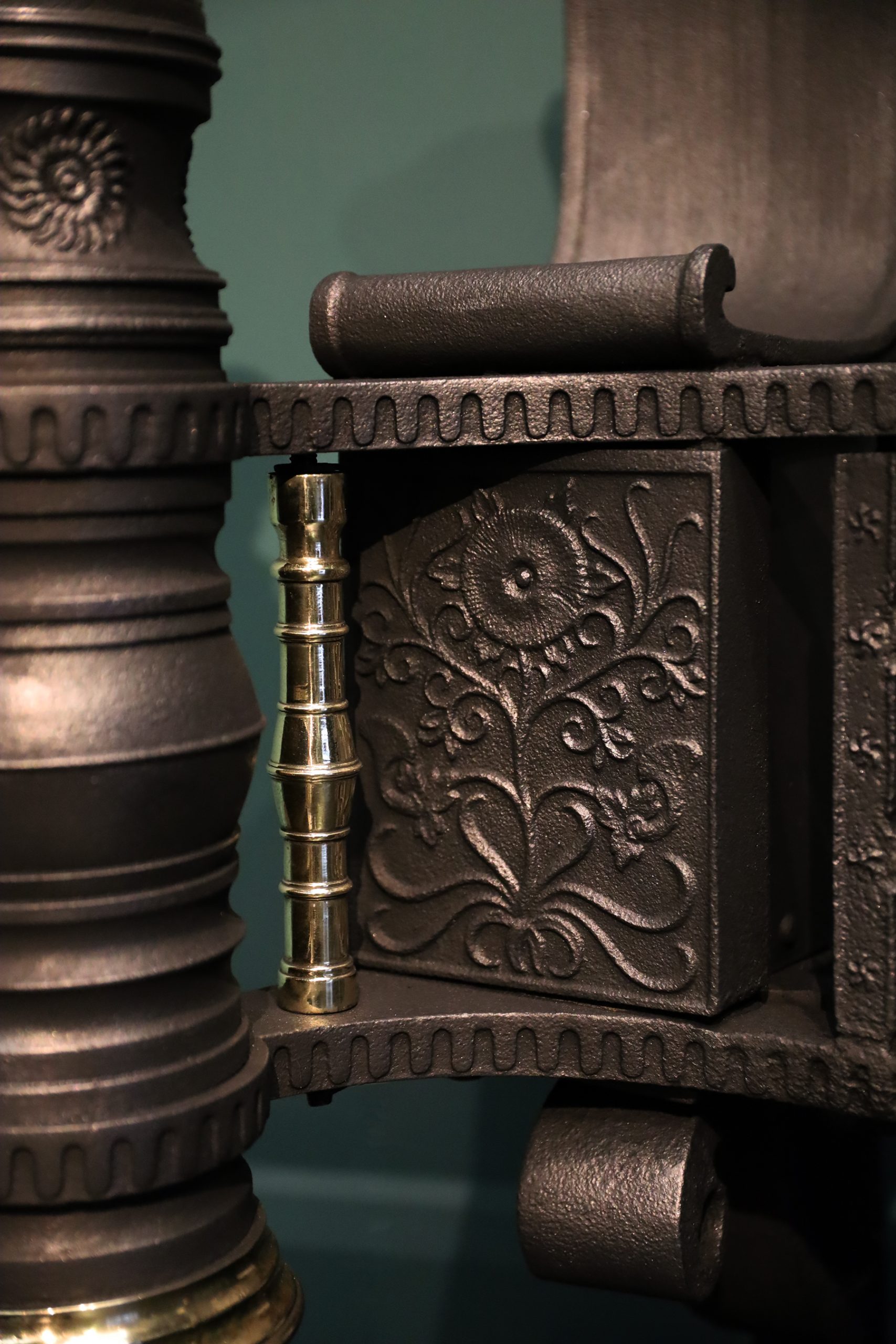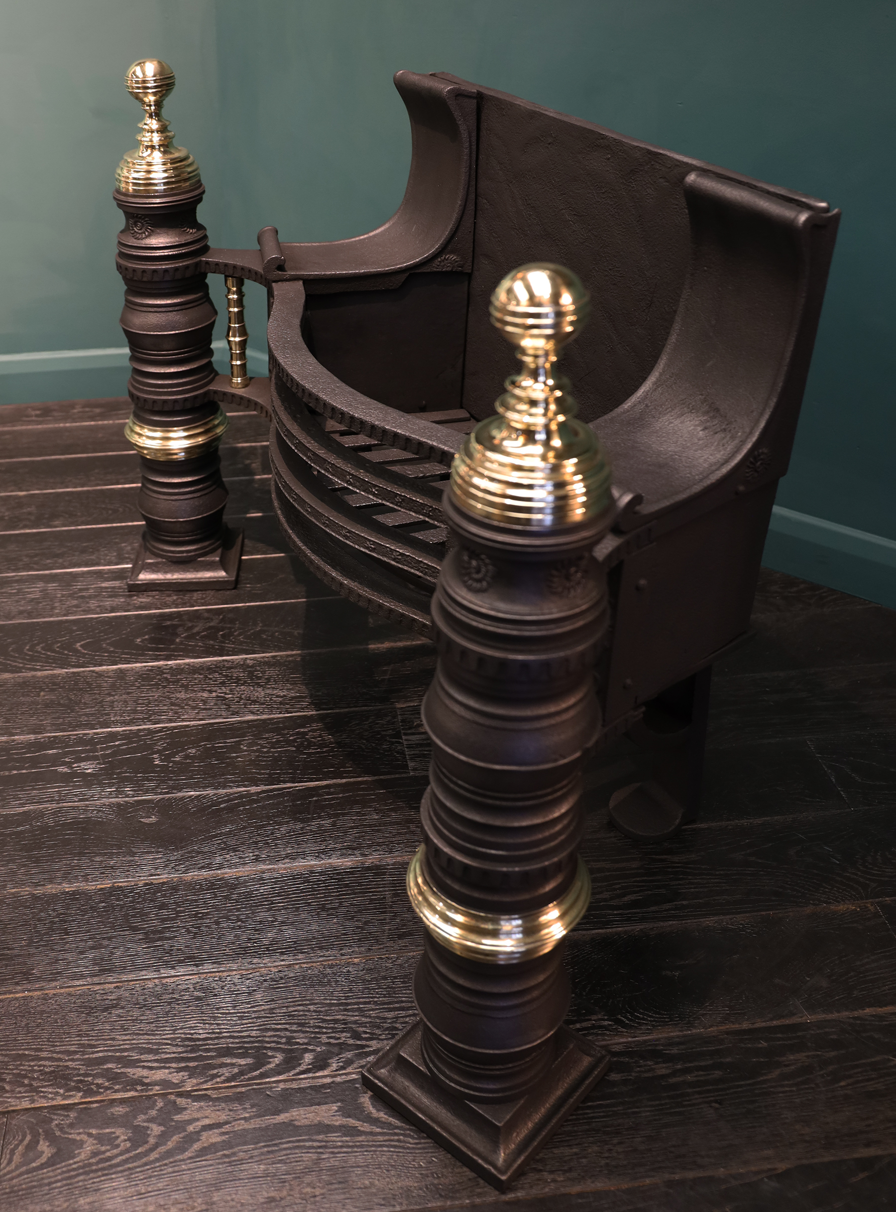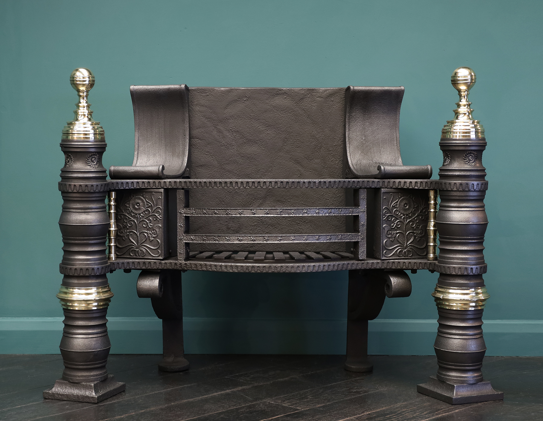 This wide imposing cast-iron pillar grate of the Queen Square type was designed by Philip Webb (1831-1915), the founder of the Arts and Crafts Architectural Movement in the 1860’s. Original drawings of this grate are archived at the V & A Collections and shown here. The grate has a curved front and pillar-style legs. The finish is in black iron with supberb brass detailing consisting of polished brass collared ball finials, collar feet and dolly detail. Curved shoulders sit above hob-fronts decorated with ornate flower detail. The rear wrought-iron legs end with tight scrolls under the fire basket. A fire grate of this type still exists at Kelmscott House (William Morris’s last residence) in Chiswick and a smaller grate in the Drawing Room at Nether Hall in Suffolk. Another pillar grate also existed at No 1 Palace Green, London, photo included here. Restored.