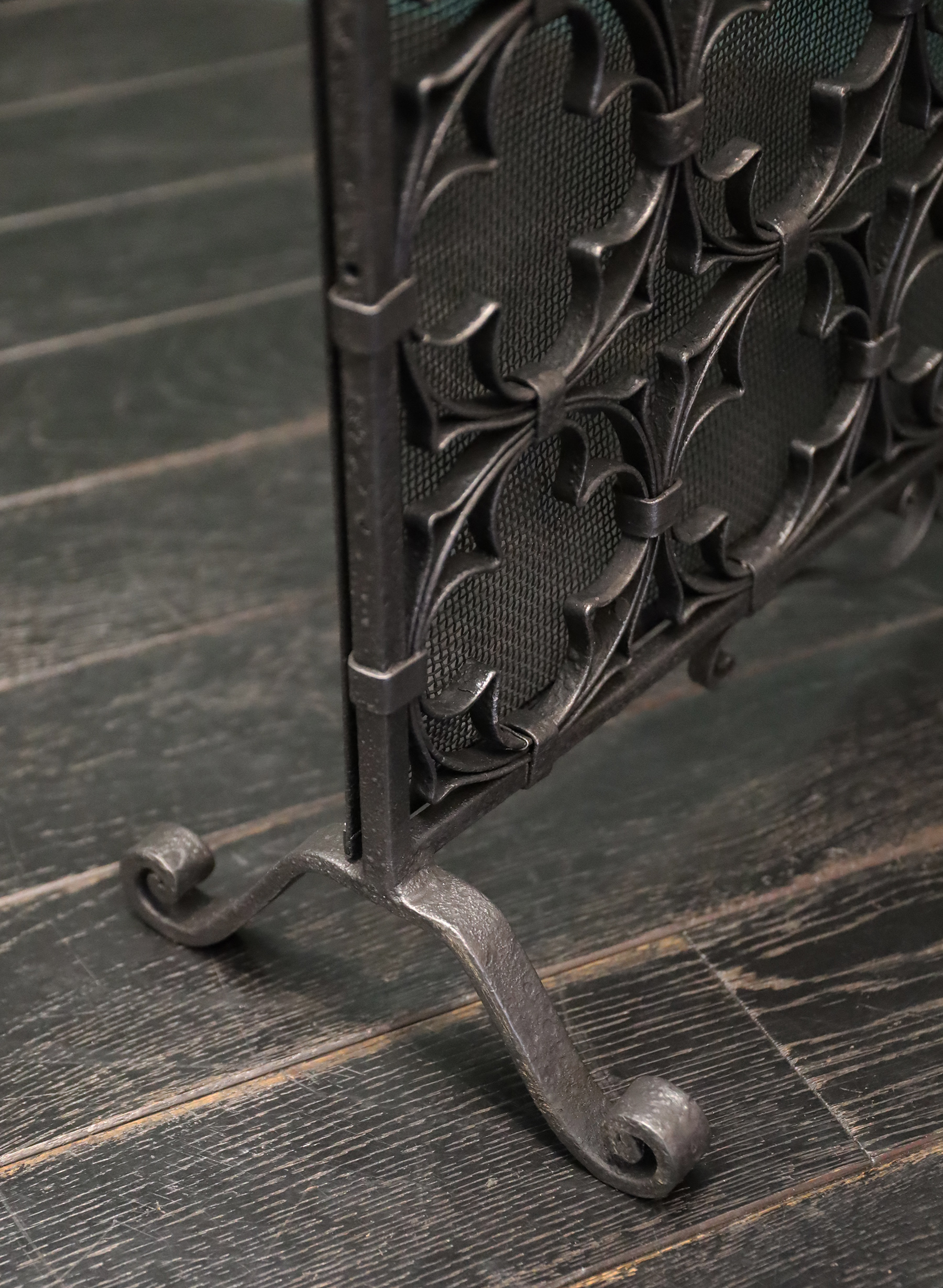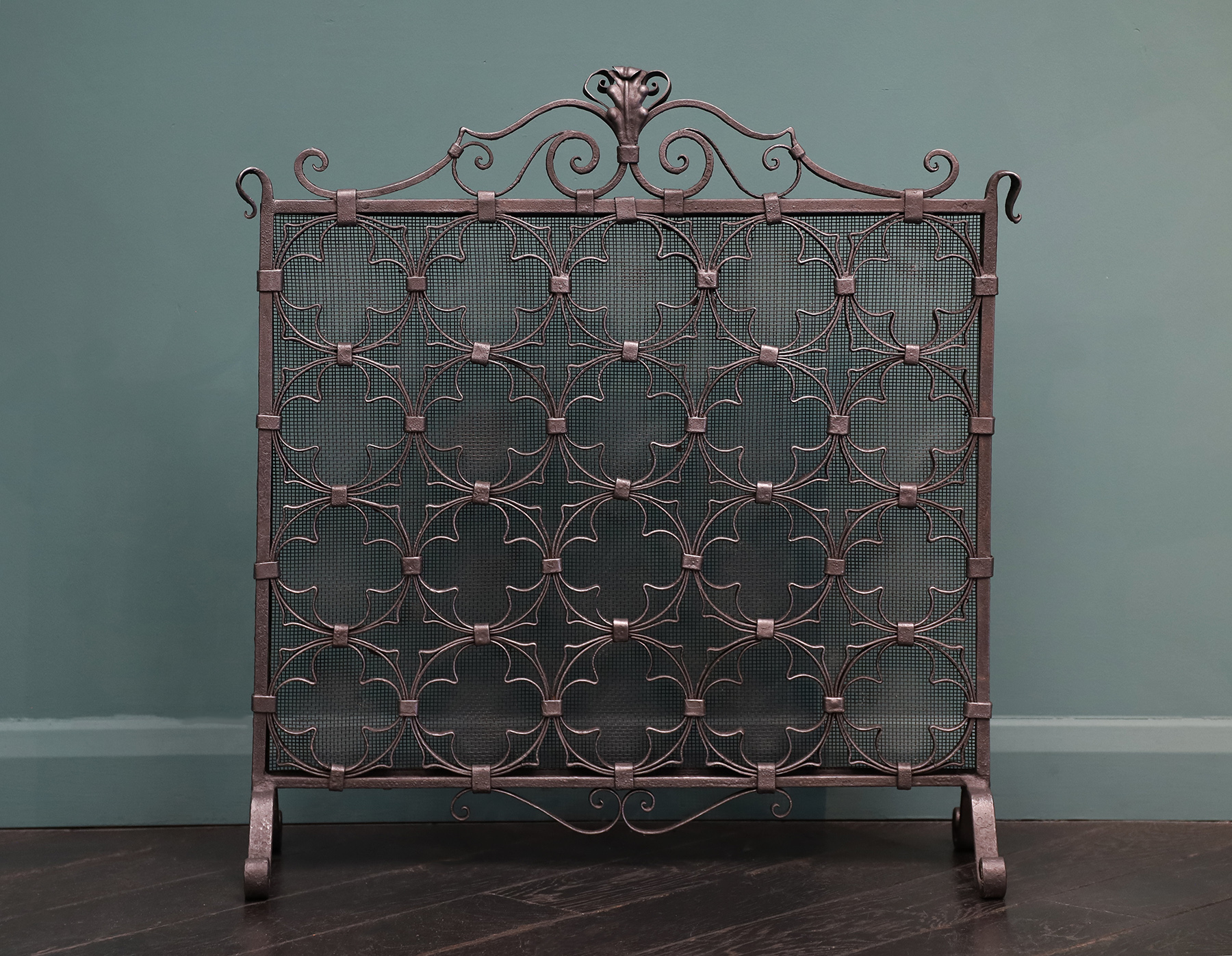 A decorative Quatrefoil fire screen in black-iron finish. The shaped handle with oak leaf and scroll detailing sits above a sturdy wrought-iron frame. Within this the enclosed quatrefoil design sits over the spark mesh sitting on arched scrolled feet. Restored.