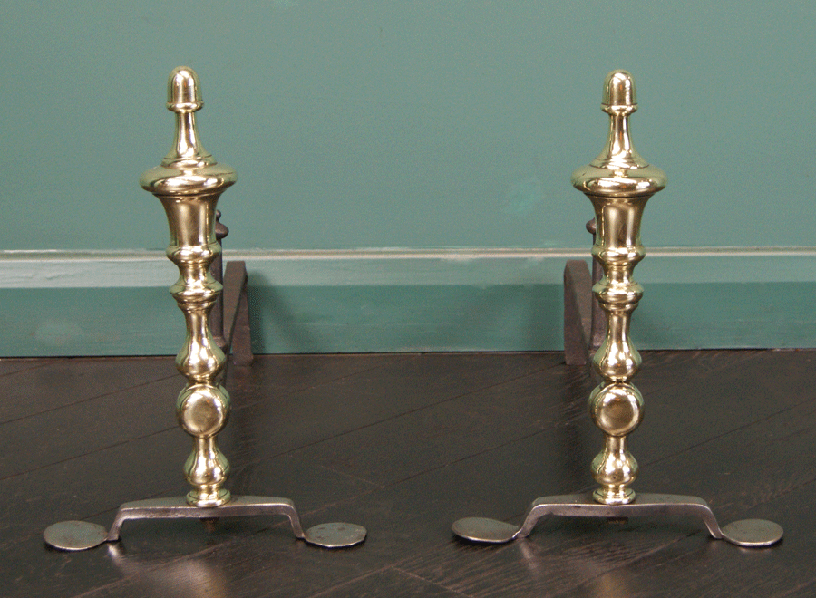 A pair of finely-made polished brass and wrought andirons. English with penny foot detail. Circa 1800.