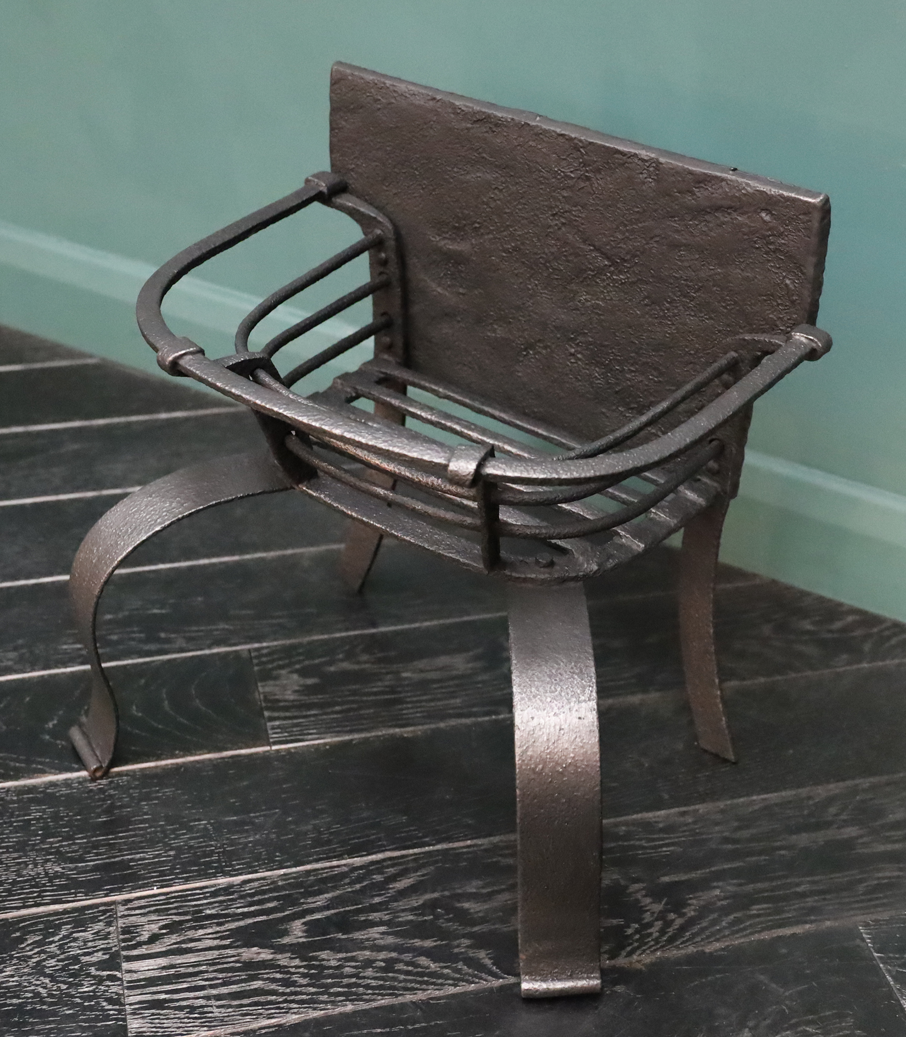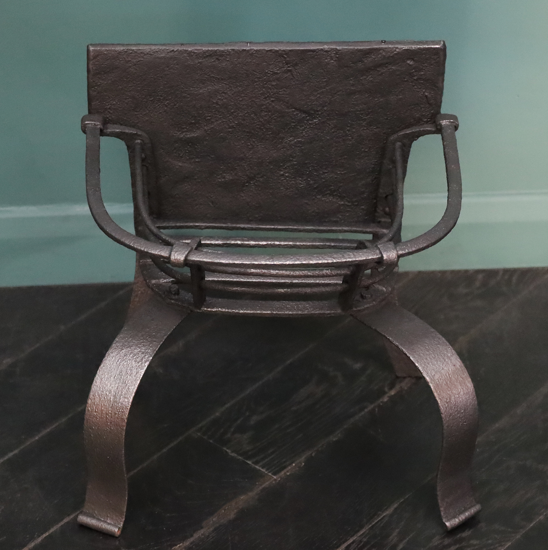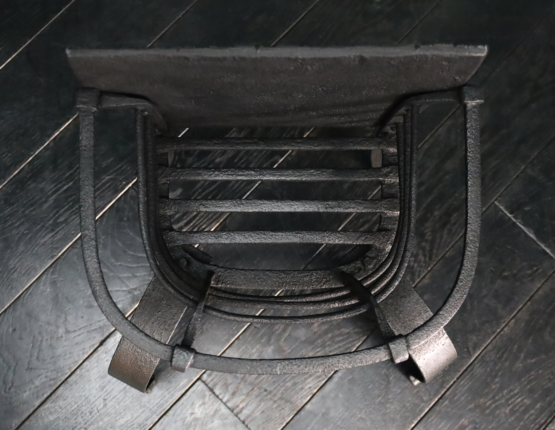 English wrought-iron fire basket with curved railed basket and rudimentary hob-top. The basket sits on extended front legs with square fire back at rear. Restored. Width at front: 16″. Width at rear: 15 1/8″. Height of burning area: 7 1/2″.