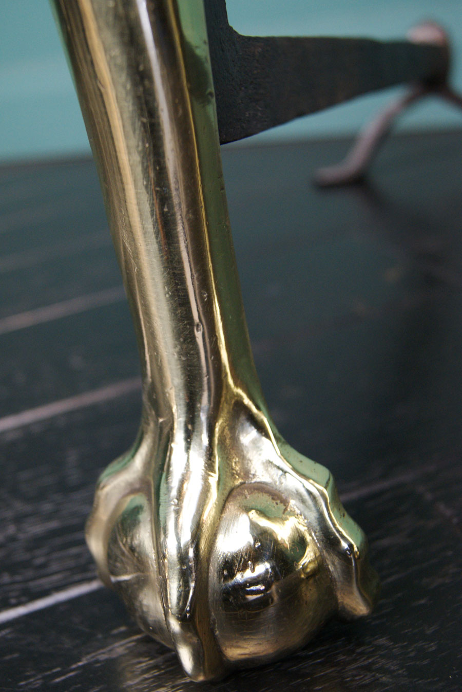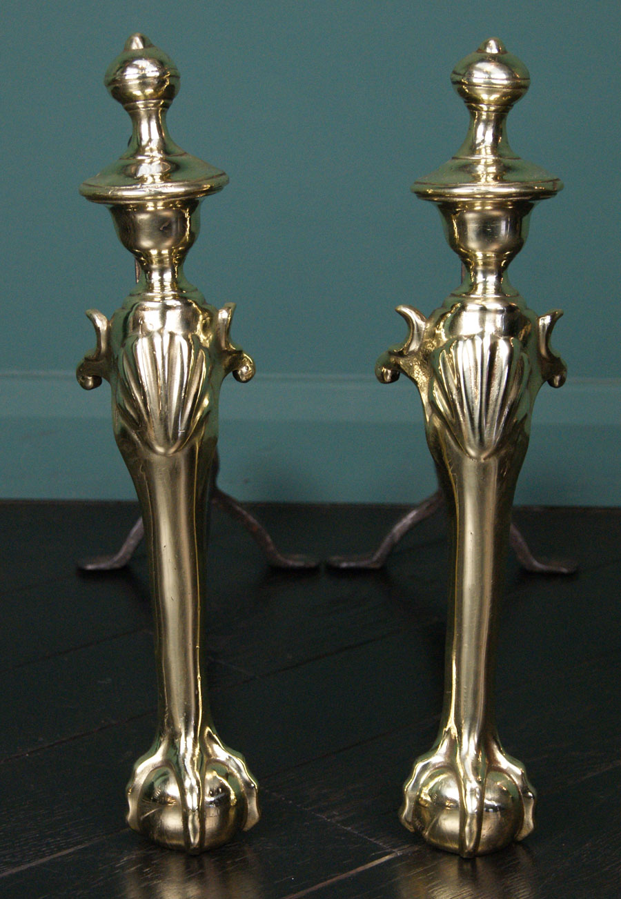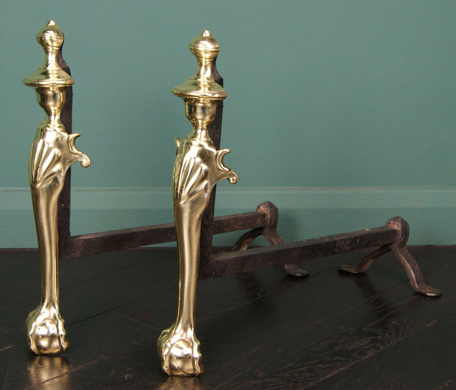 A pair of polished brass andirons with ball and claw feet and wrought rear log supports. These are almost identical to the andirons featured in Gentle & Feild's Domestic Metalwork 1640 -1820.