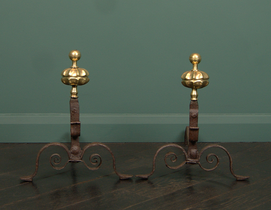Italian wrought and brass andirons with scrolled arched supports, front spit-hooks and brass faceted finials.