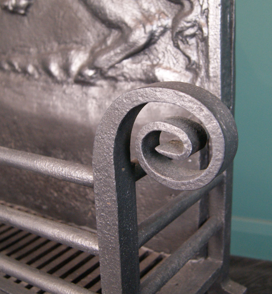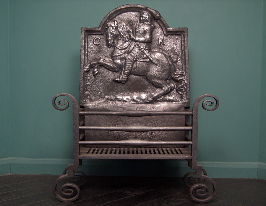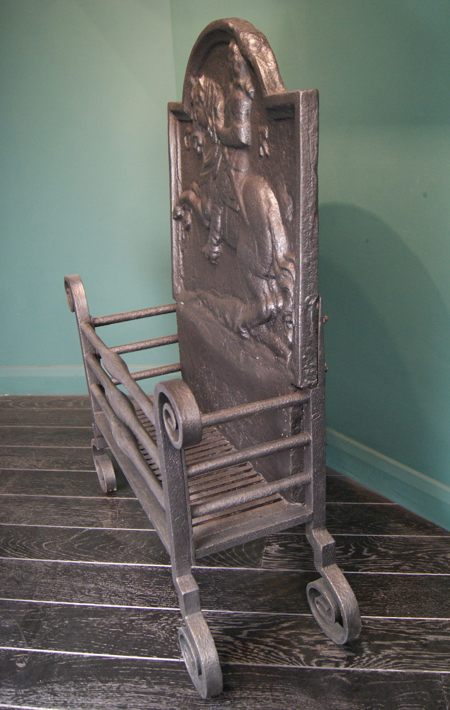A large wrought-iron fire basket, with shaped fire bars, scrolled feet and finials by Thomas Elsley. The ornate fire back depicts a horse and rider; finish in stove black and graphite wax.