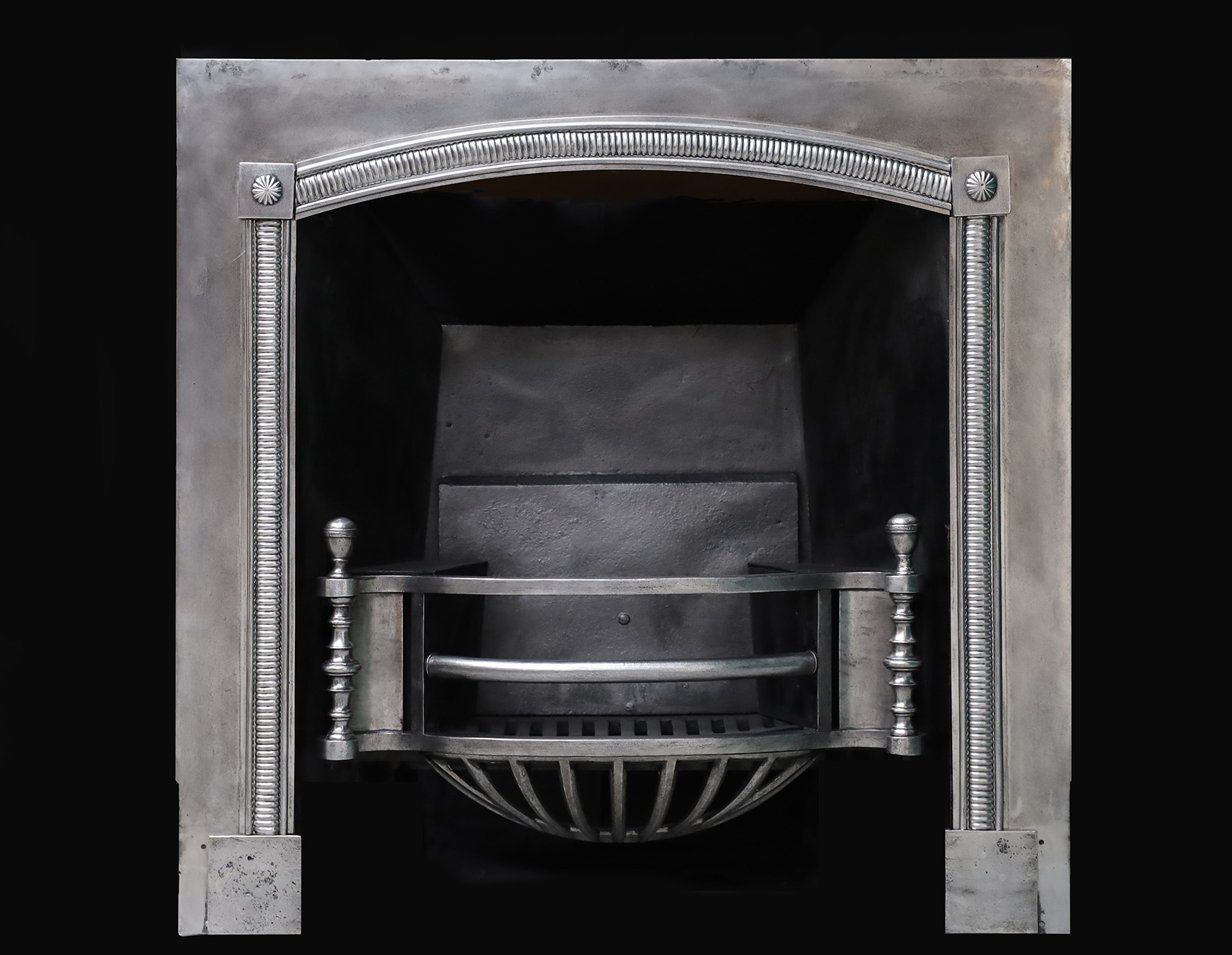 A fine polished steel register grate. The front surround with arched opening framed with gadrooned moulding. The round and rectangular fire bars are set over a curved fire basket, flanked by concave hob fronts set behind turned steel dolly detail.