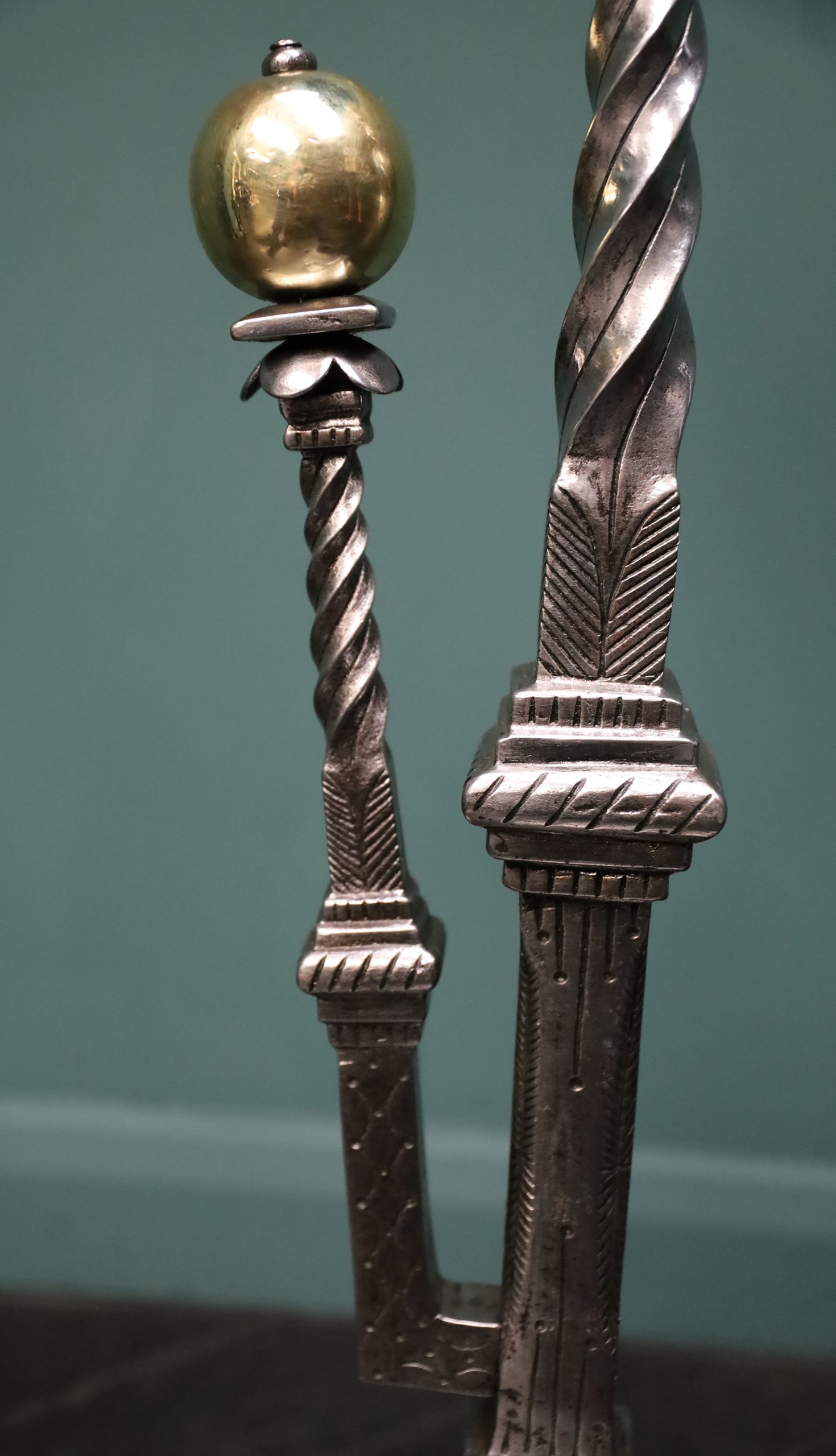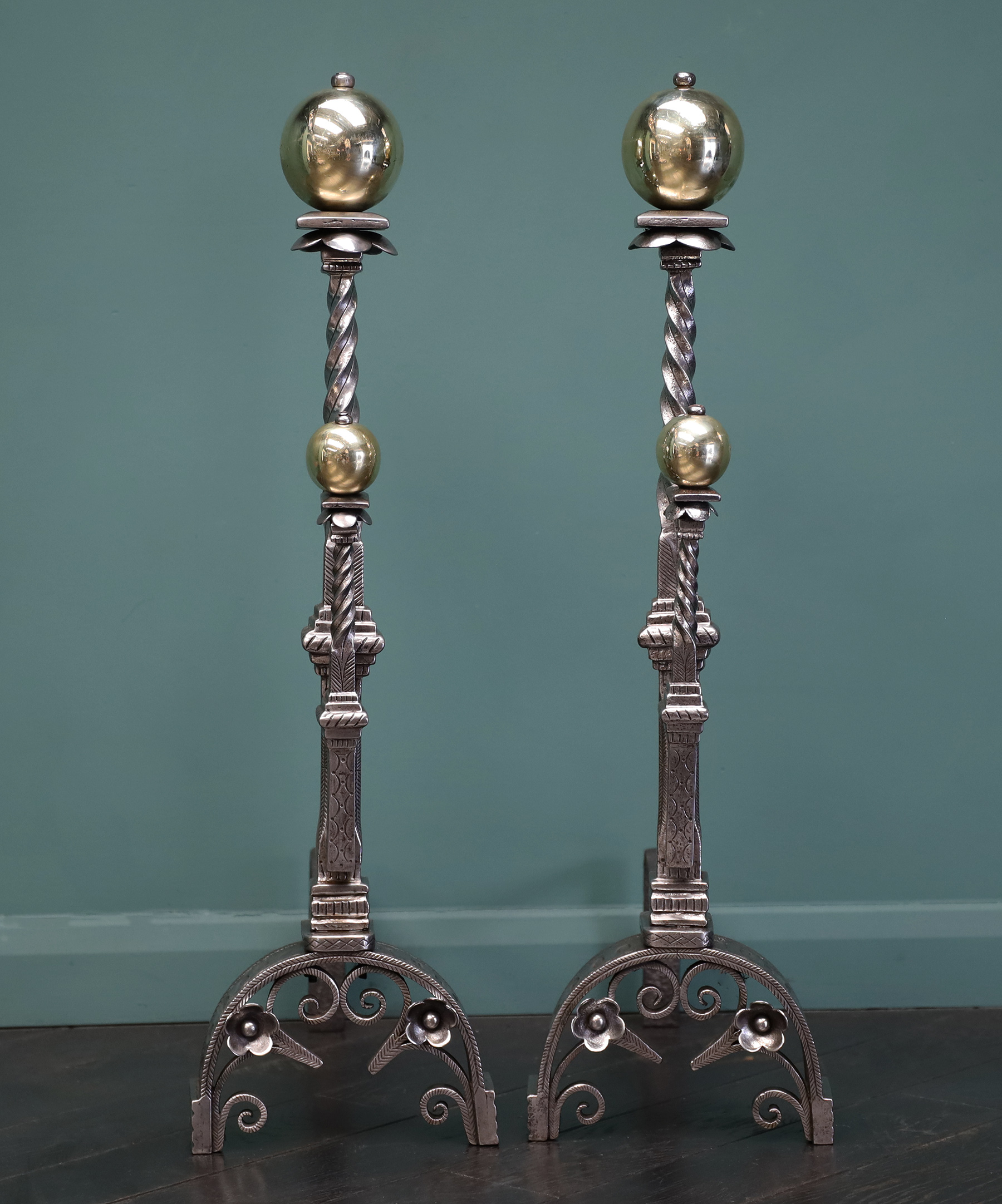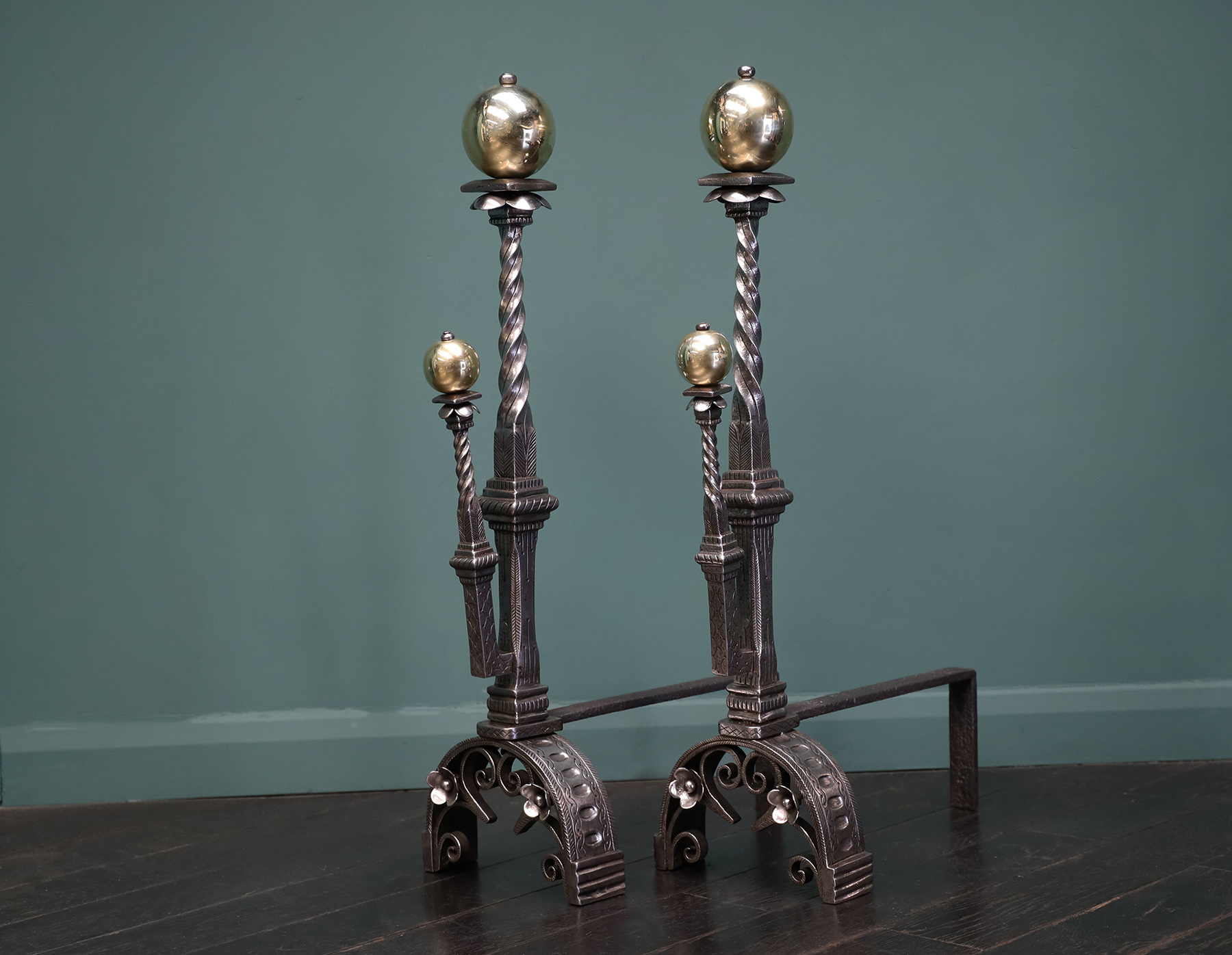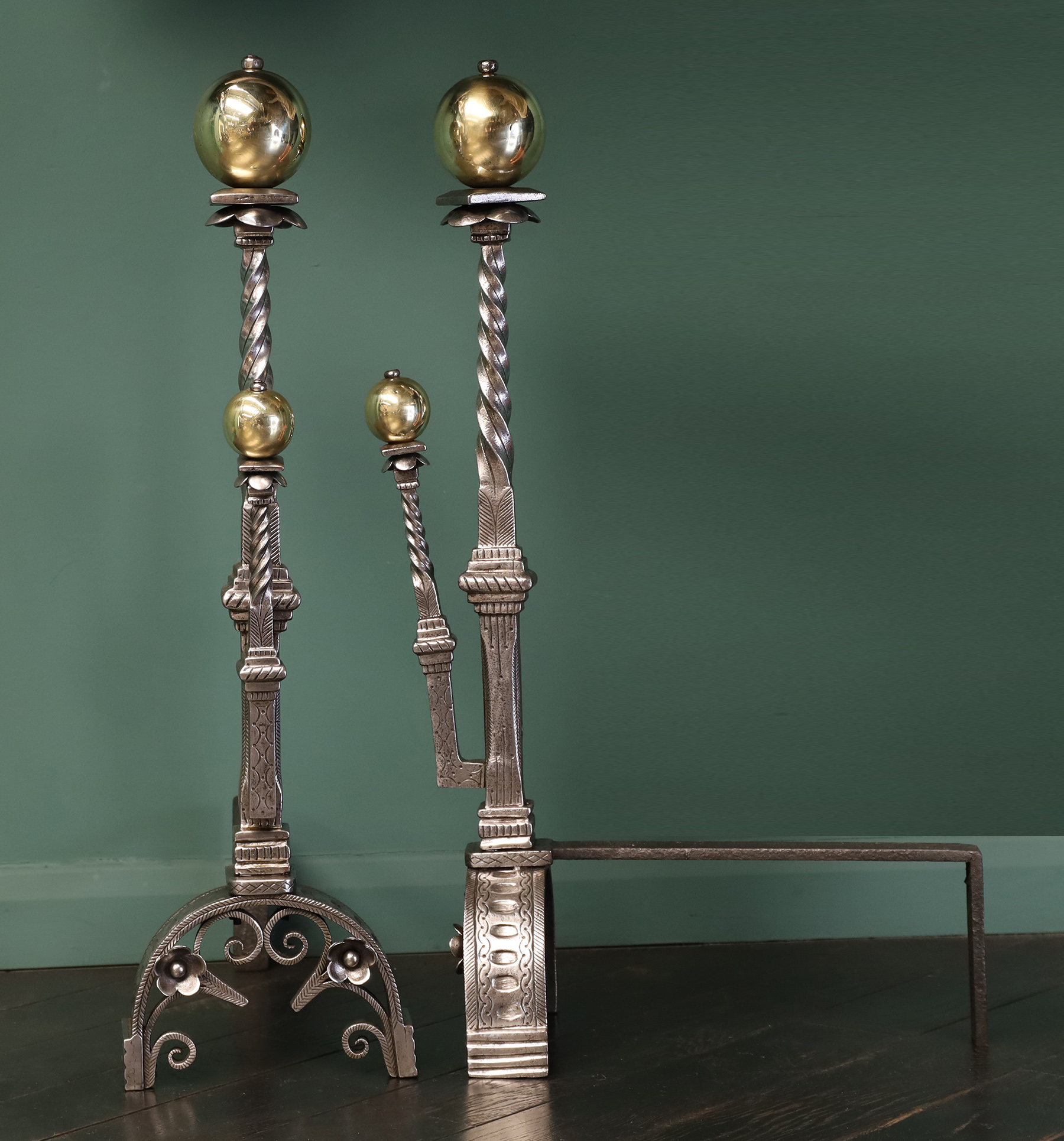 A magnificent pair of Italian polished brass & wrought fire dogs, andirons. The standards with twist, stepped-collars and detailed incising. All set on arched supports with inner trefoil and floral motifs. The brass ball finials sit over petals and steel plinths. Restored.