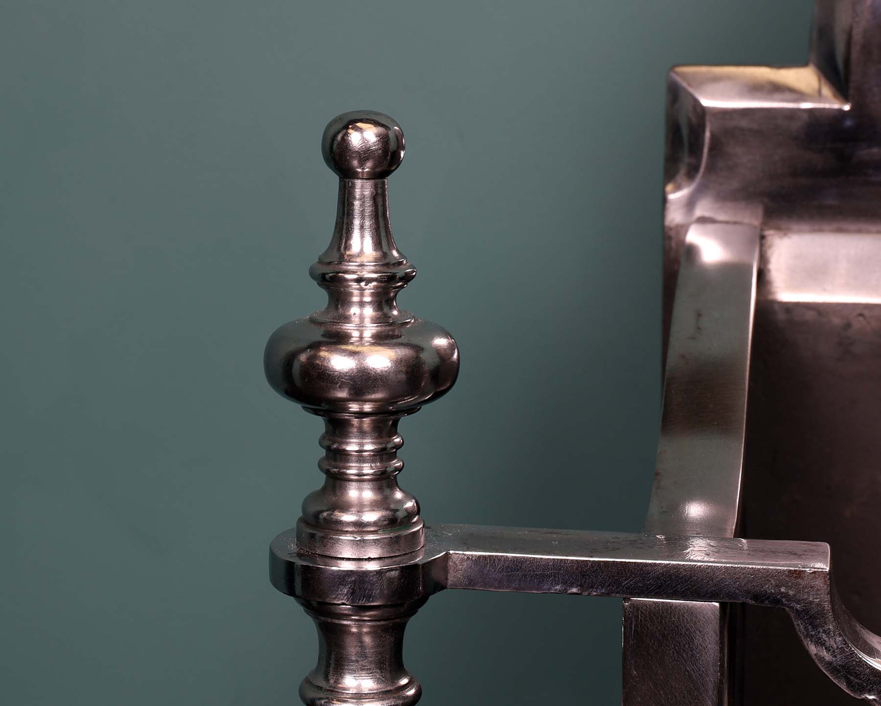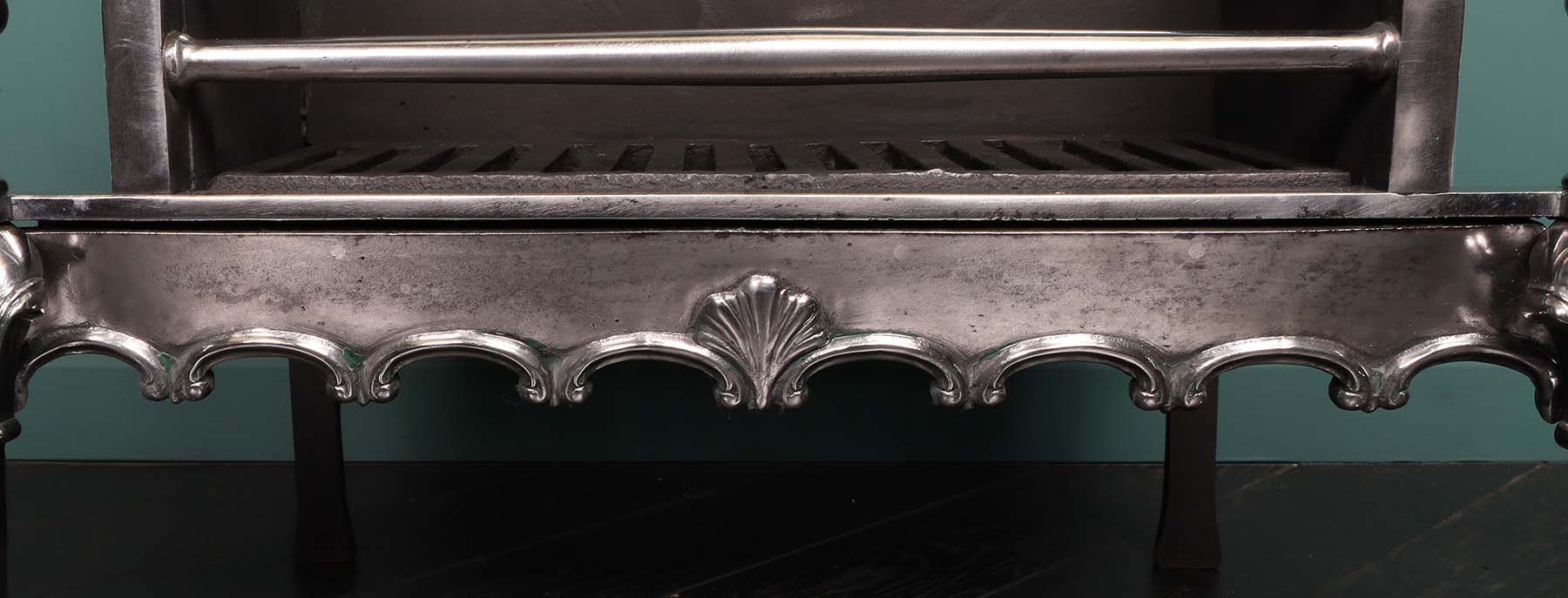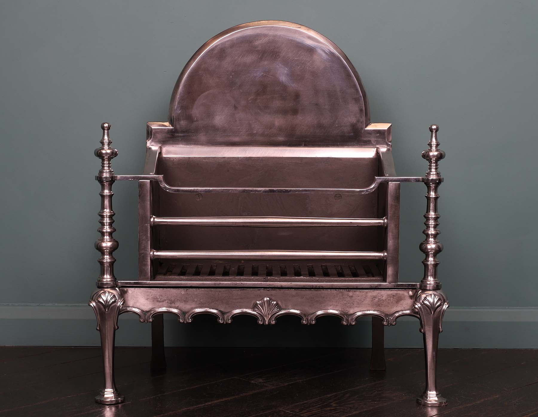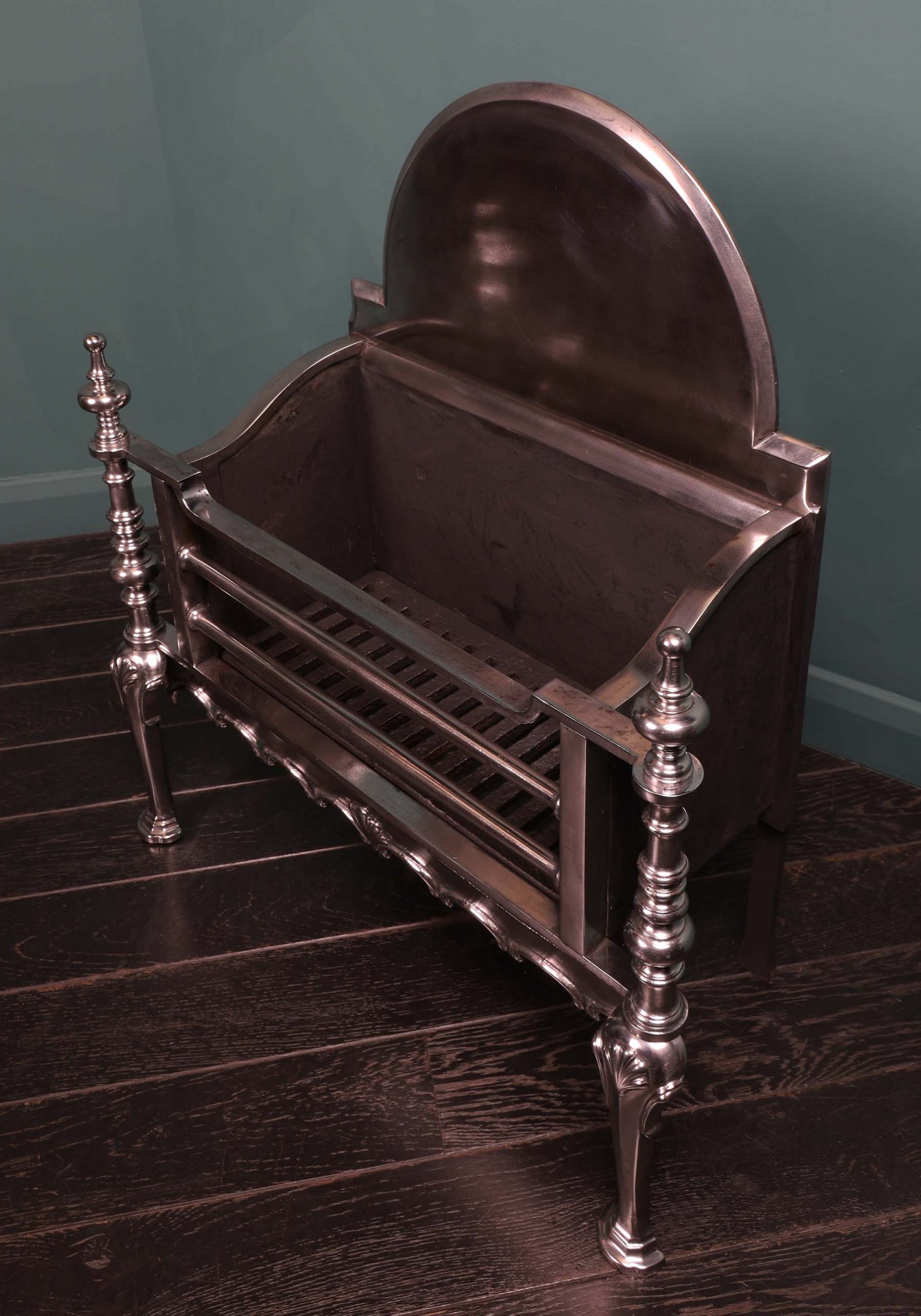 A fine polished steel fire grate in the Queen Anne manner. The shaped fire bars sit between steel turned standards with scallop detail. The scallop shell also sits centrally between ‘C’ scrolls on the fret plate with an arched polished fire back. Manufactured by Bratt Colbran. Restored.