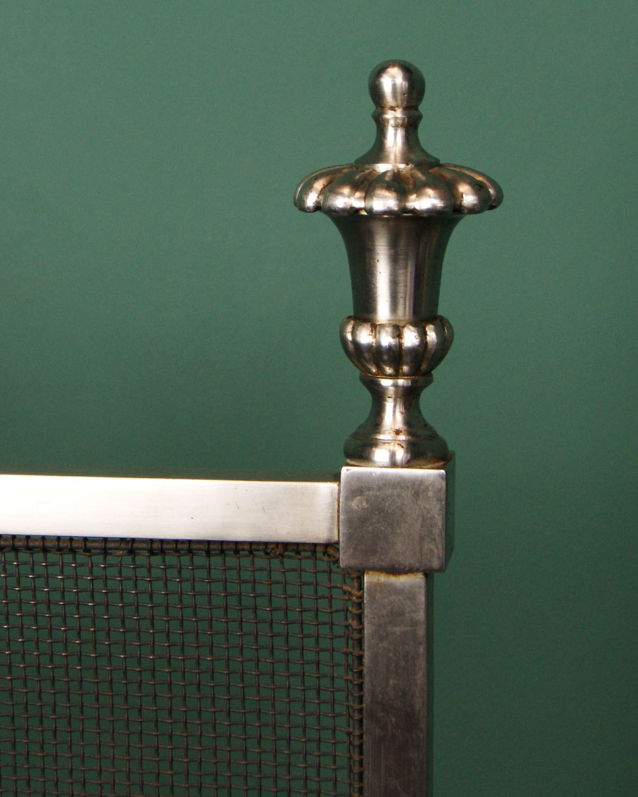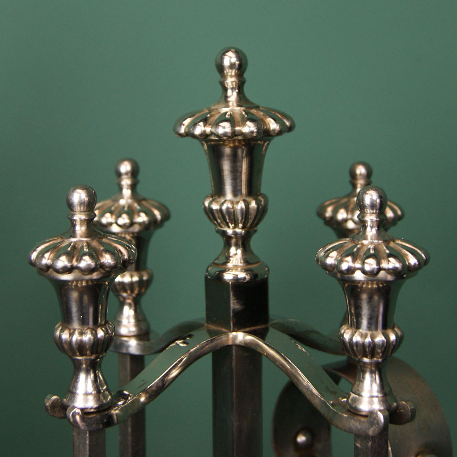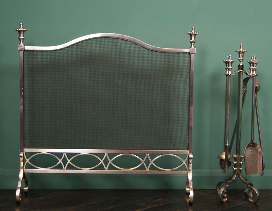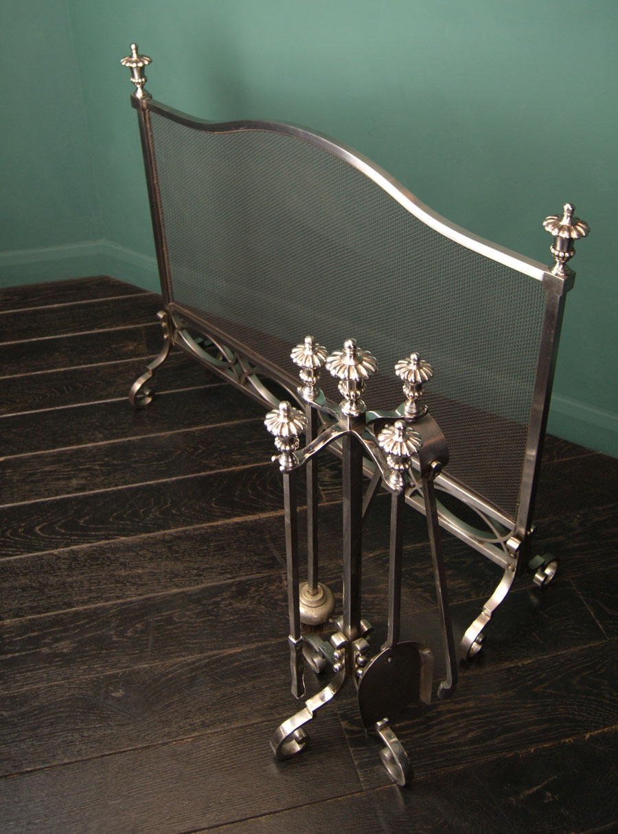 Polished Steel Fire Screen and a set of fire tools with stand. The smart steel screen houses black spark mesh over steel openwork on scrolled feet. The fire tools comprise of poker, tongs, shovel and brush on a stand. The stand with scrolled feet and all topped with gadrooned flower-pot finials.