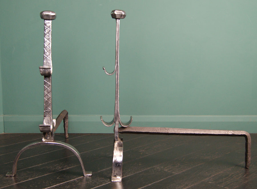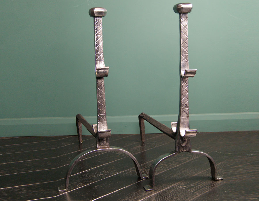 Polished wrought-iron andirons with cross-hatching engraving and spit-hooks to front up-rights on arched supports. Depth of log supports can be adjusted
