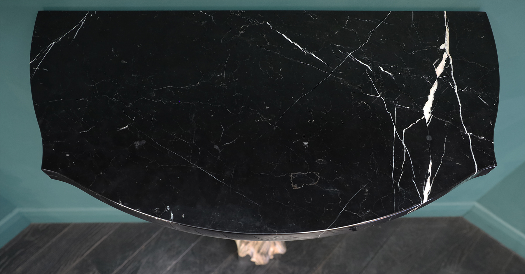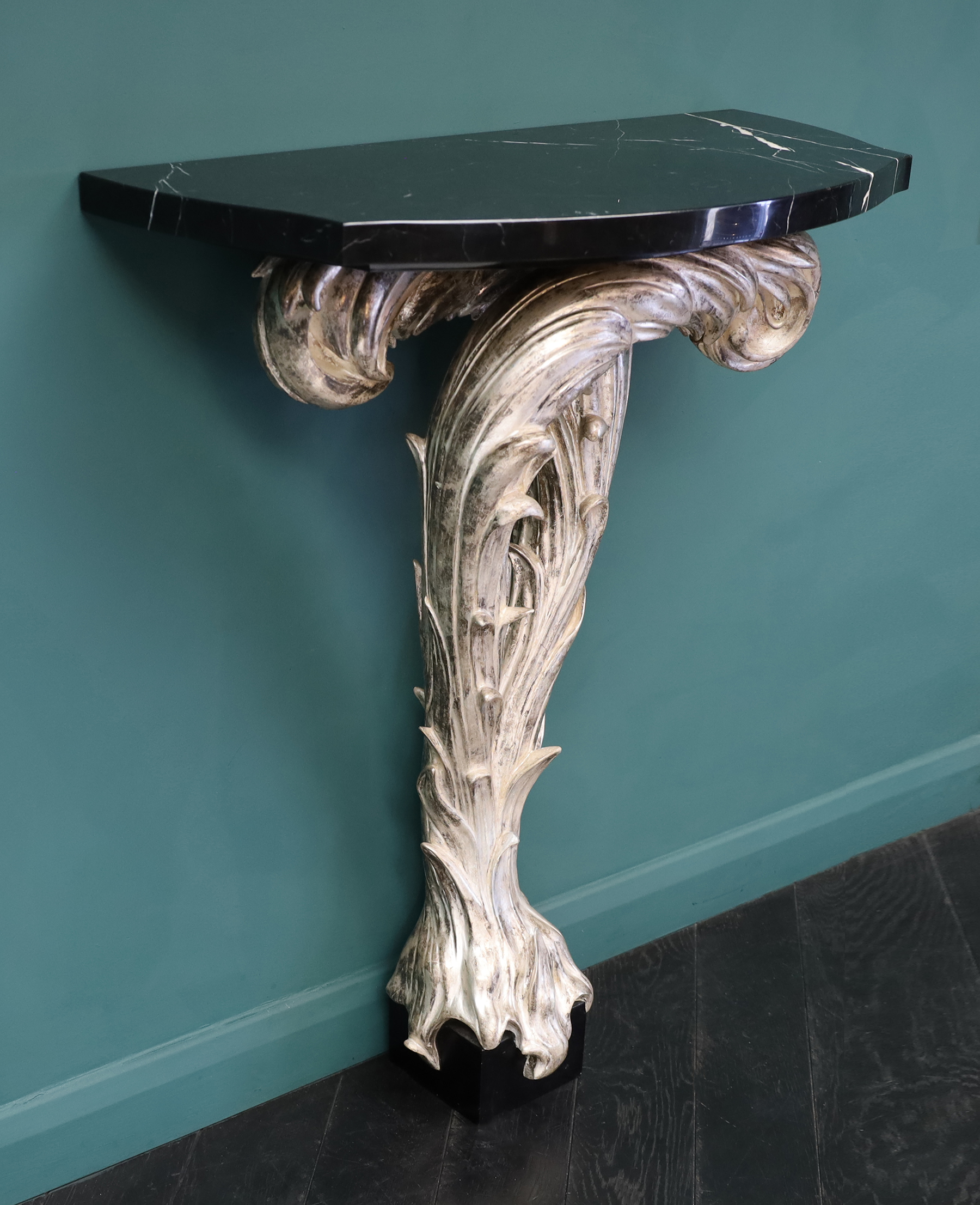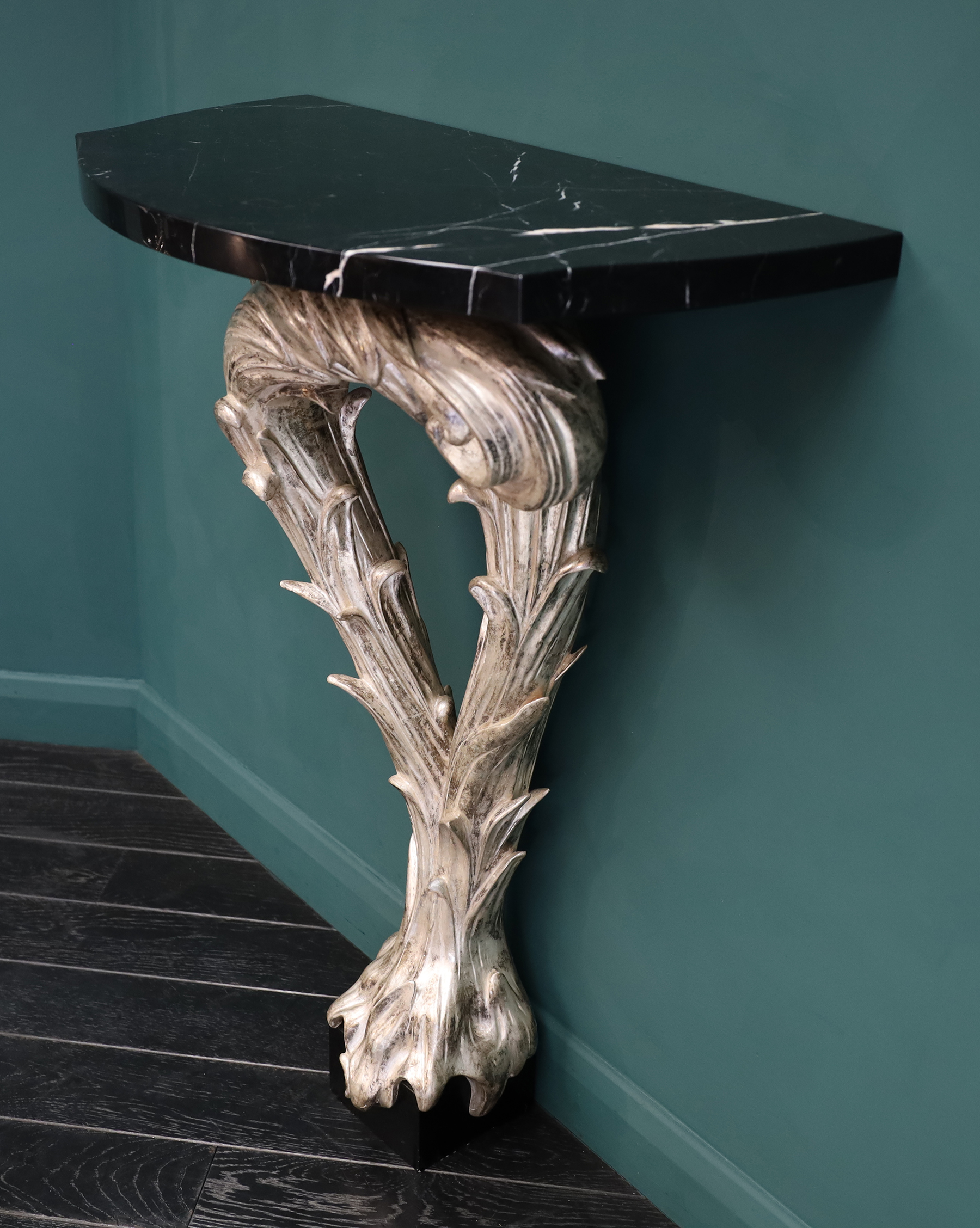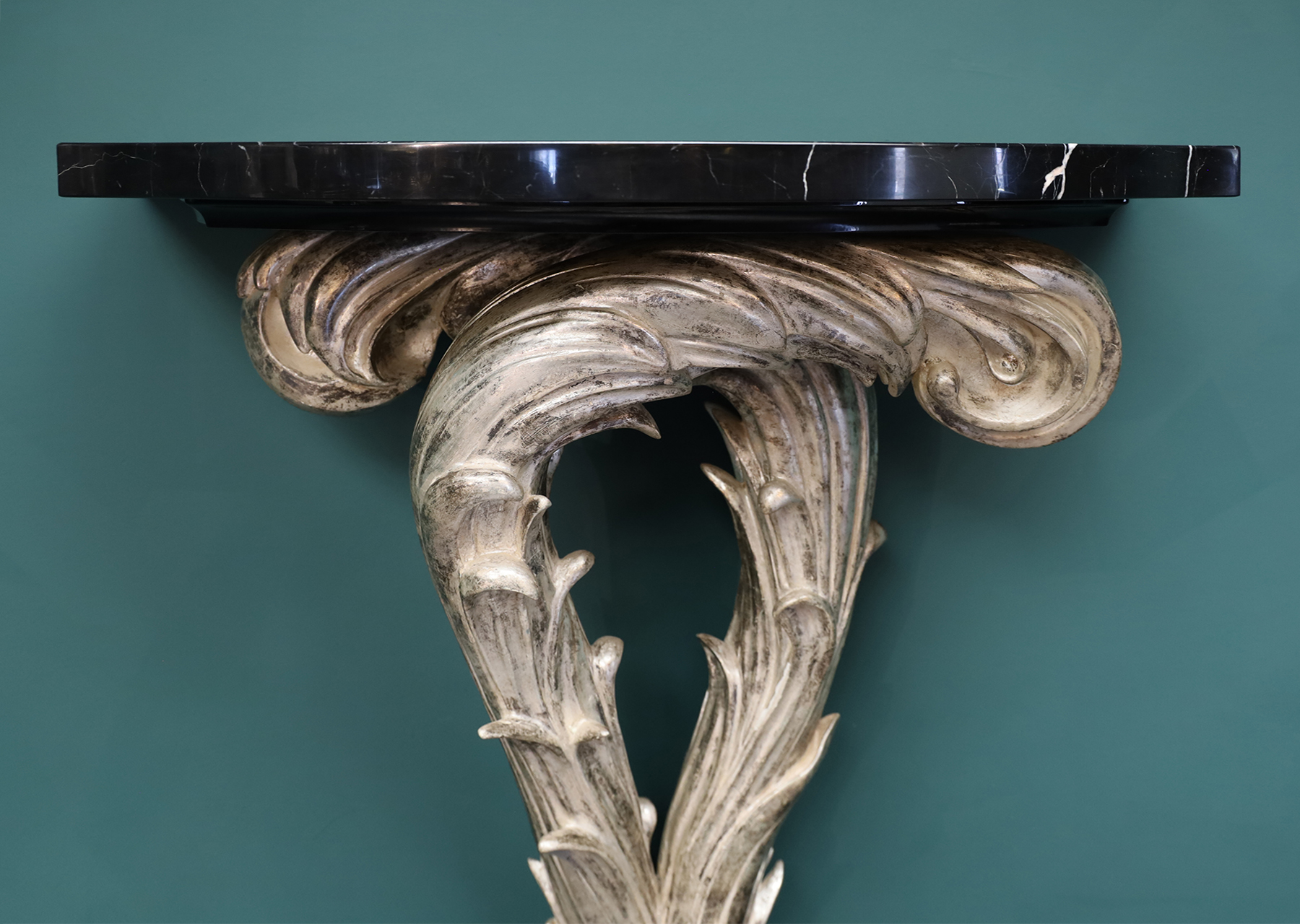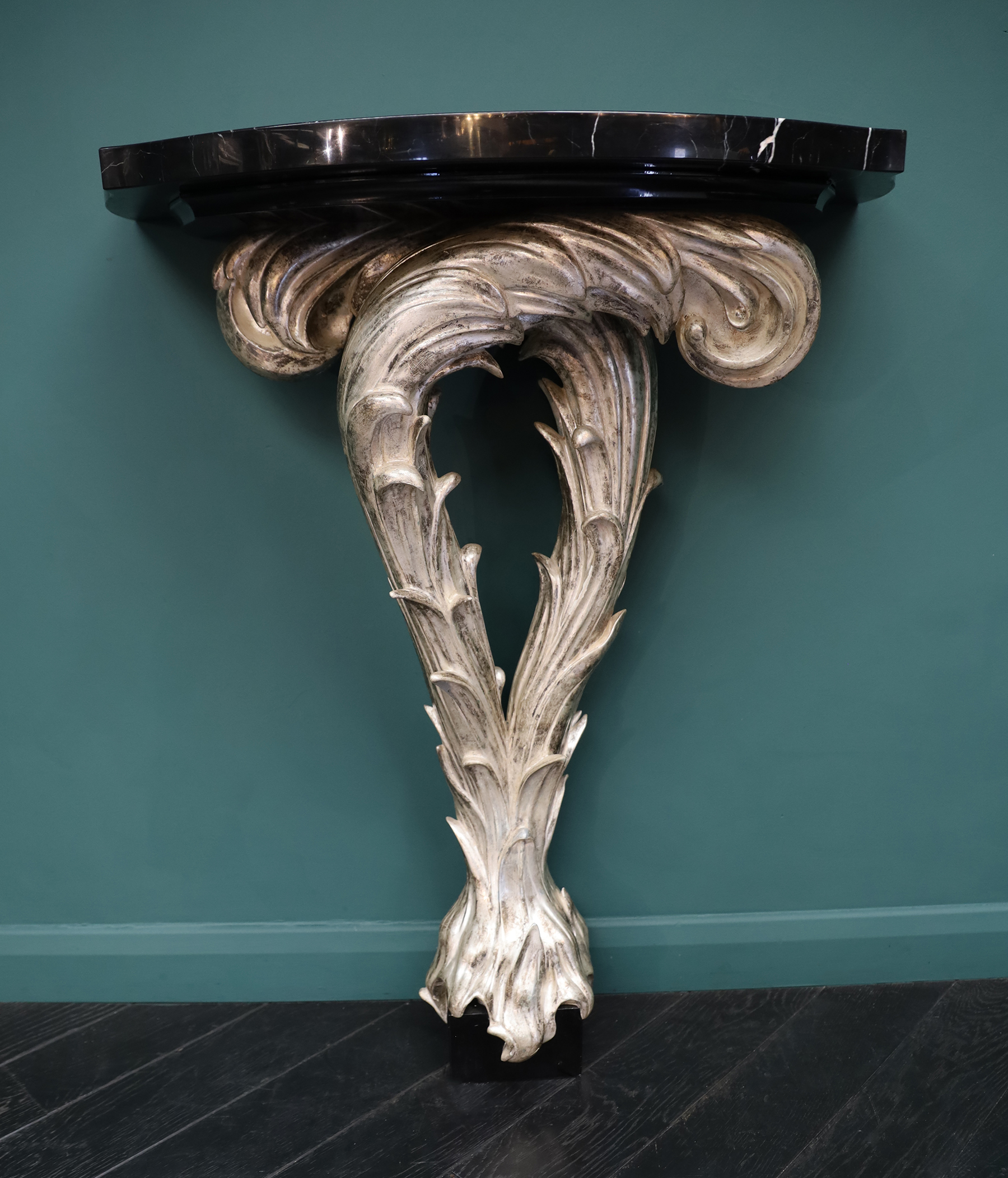 A Baroque Revival console table after a design by Serge Roche. The Baroque stylised foliate legs supported on plinth have been sculptured to create a support for the shaped black marble table top. The marble top with white-veins rests upon a composite bed-moulding in black. The console table is in beautiful condition. One of a pair. Circa Late twentieth century