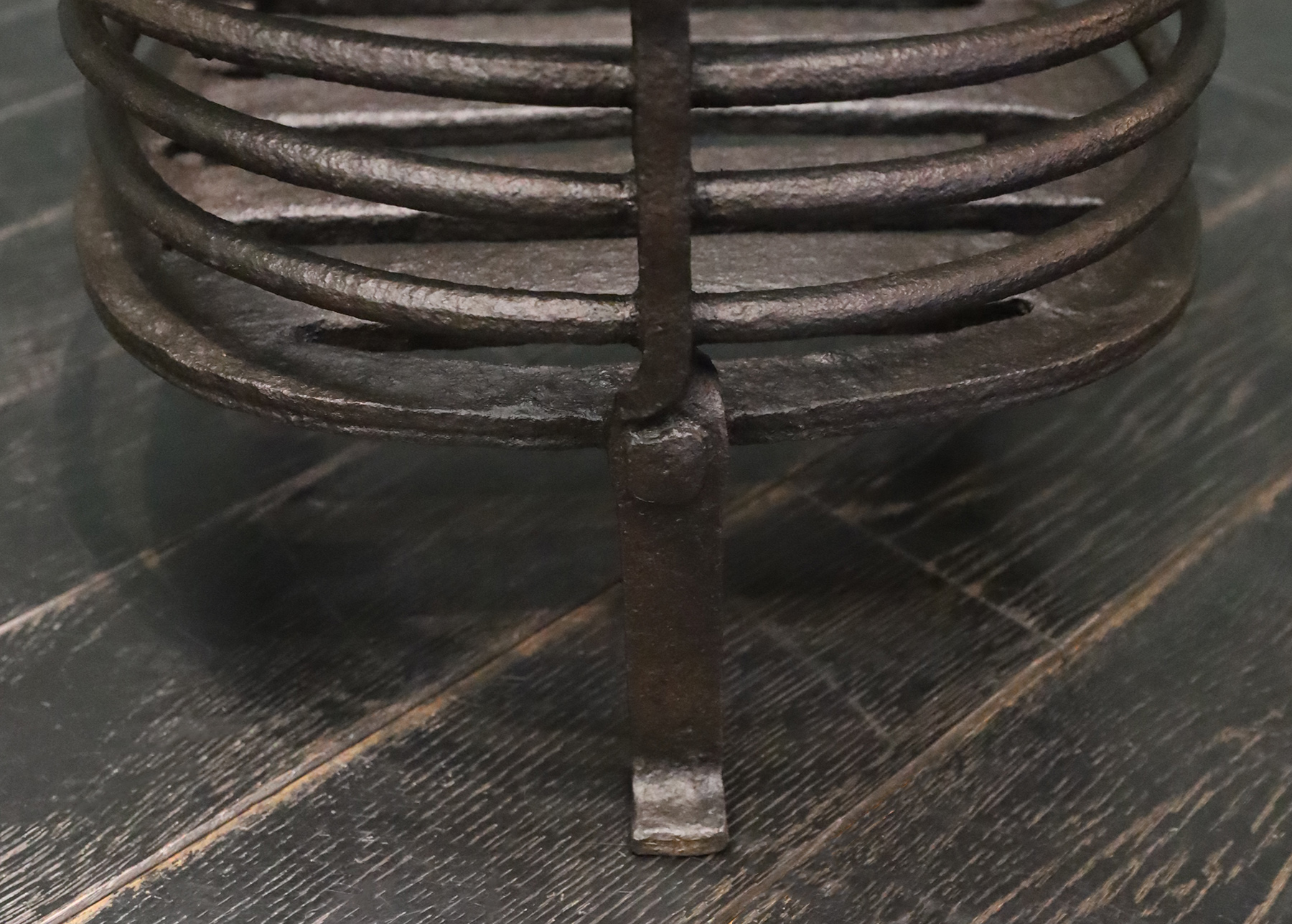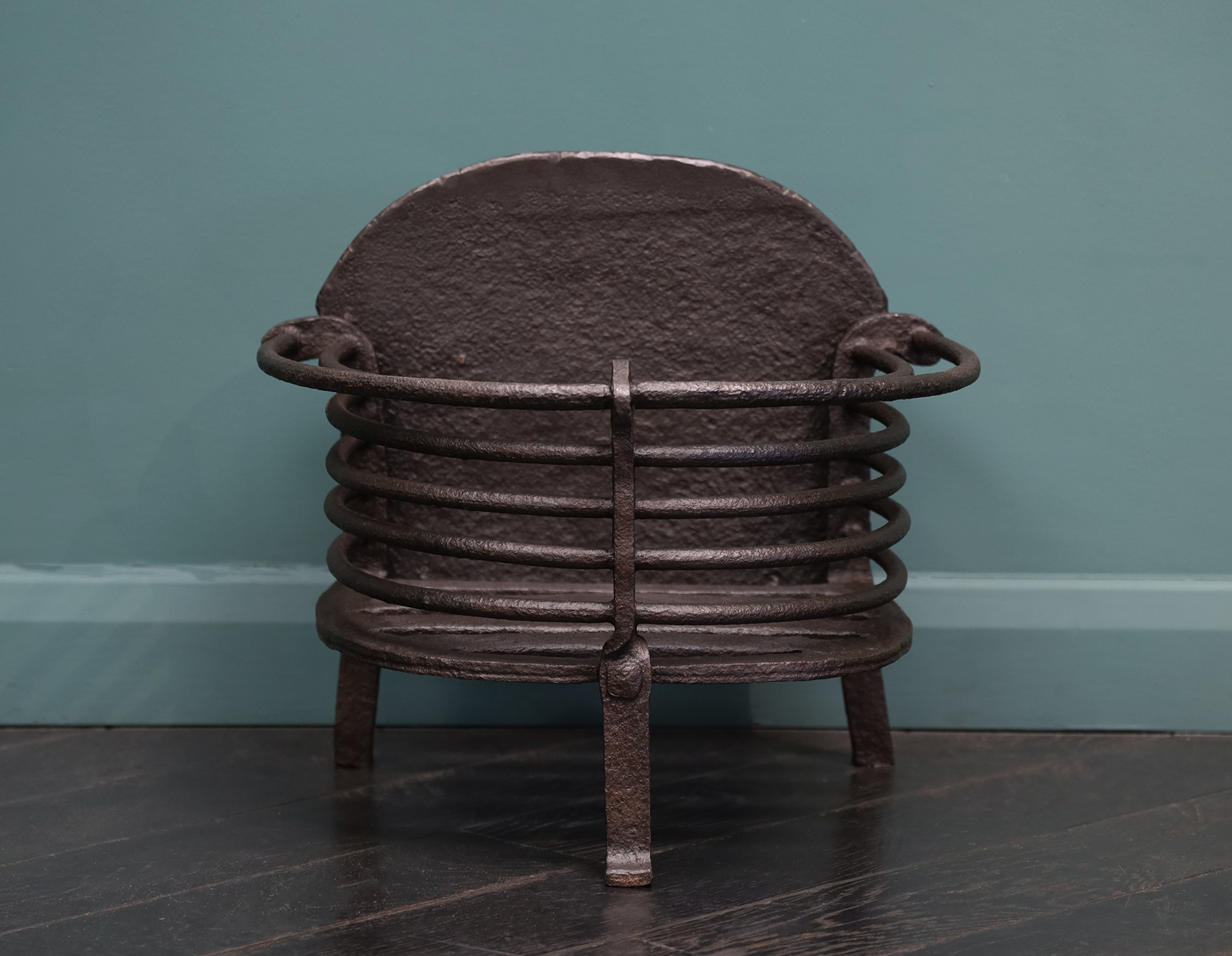 An English semi-circular wrought-iron fire basket. The round fire bars form enclosure and rudimentary hob-top supported on three legs. Rivet to front leg with twist. Finished in wax.